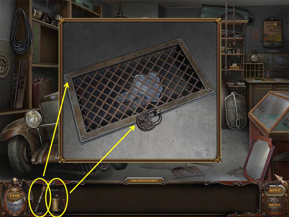 The missing Nobleman informs you there is a SHARD in the fireplace. Attempt to take it. A metal grate appears blocking your way.