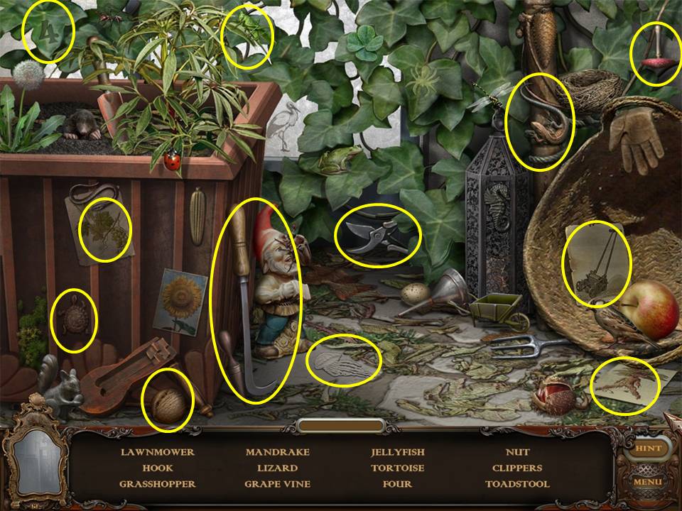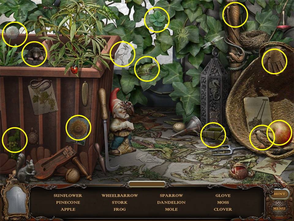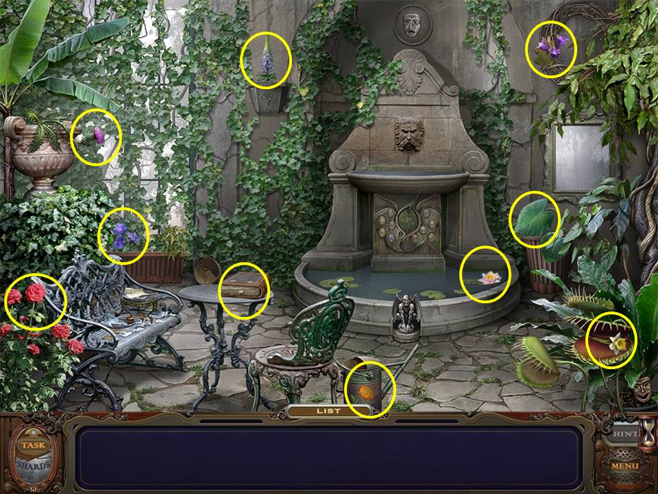 Find and pick up 10 FLOWERS. Some may be hidden so you may have to move or open items within the scene. For example, the book on the table must be opened to find one FLOWER. Move the large leaf to the right of the fountain to find another FLOWER. Clip the rose with the CLIPPERS. When you have located 9 FLOWERS, a Hidden Object Area will appear.