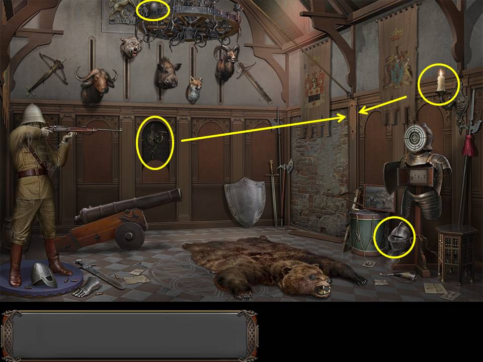 Click on the drum in the Armory to play a Hidden Object Area.
