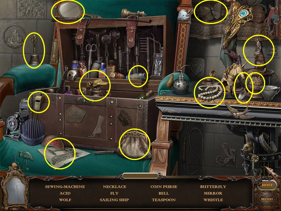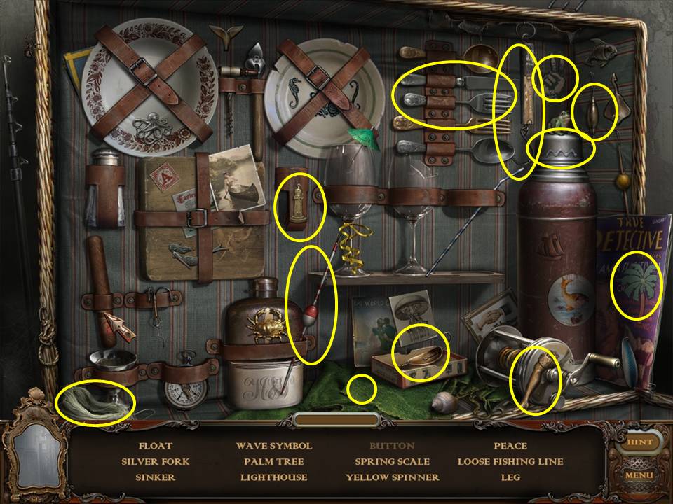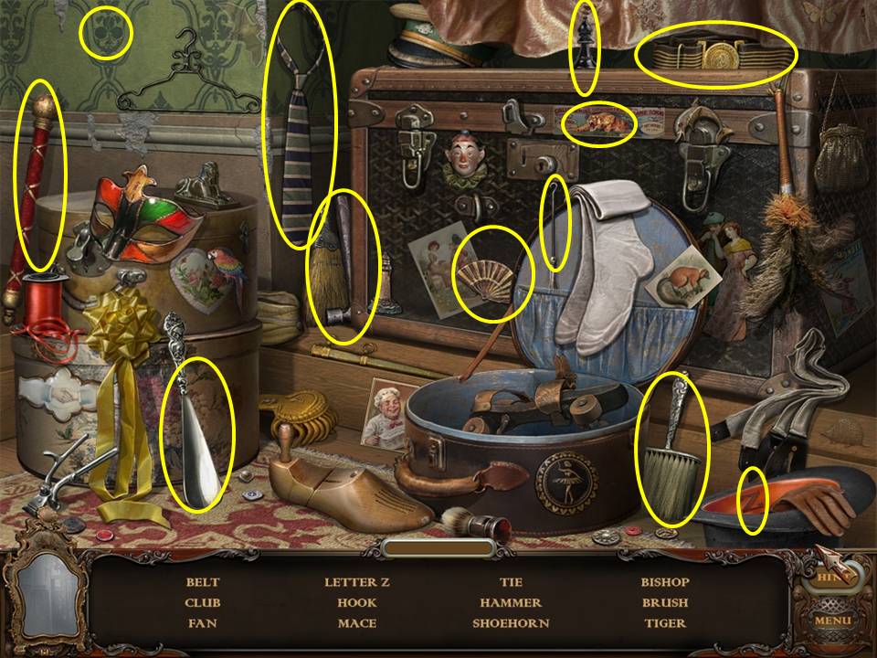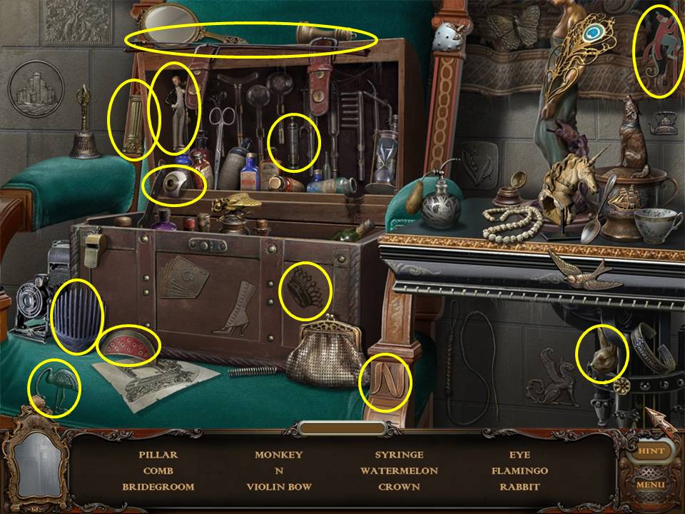 Within the room, locate the items listed. The cigar case is inside of the leather valise that is sitting on the chair. To find the button, you must play the Hidden Object Area within the suitcase a second time.