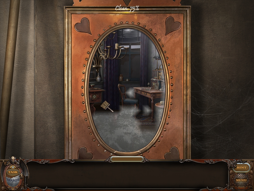 Left-click and hold when you brush the mirror to remove all the dust. You must get the mirror totally clean. Your progress percentage is indicated on the top frame of the mirror. When the mirror is clean, you may proceed to the Living Room.