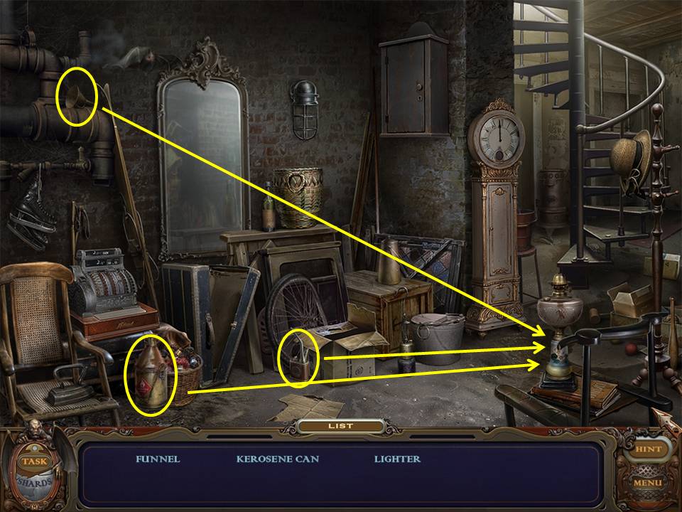 Pick up the FUNNEL, KEROSENE CAN, and LIGHTER.