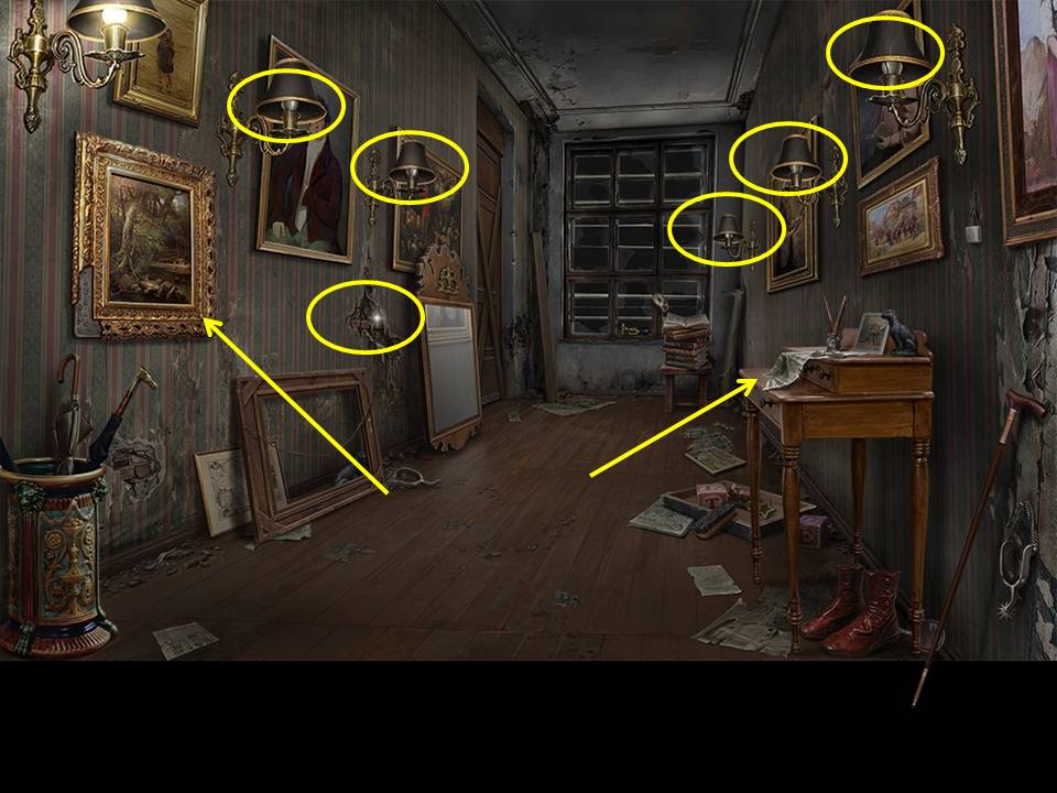 Play the Hidden Object Area (HOA) located by the stack of books at the back of the corridor.
