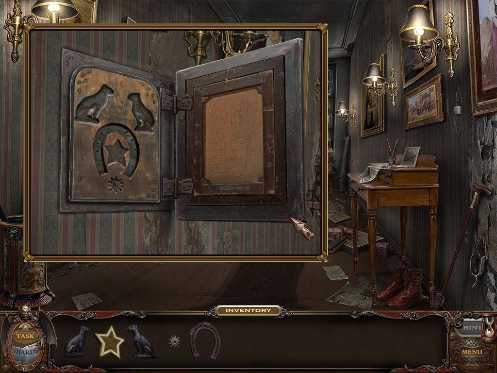 Insert the HORSESHOE, SPUR, STAR and CAT FIGURES into the appropriate spaces behind the painting to open the safe.