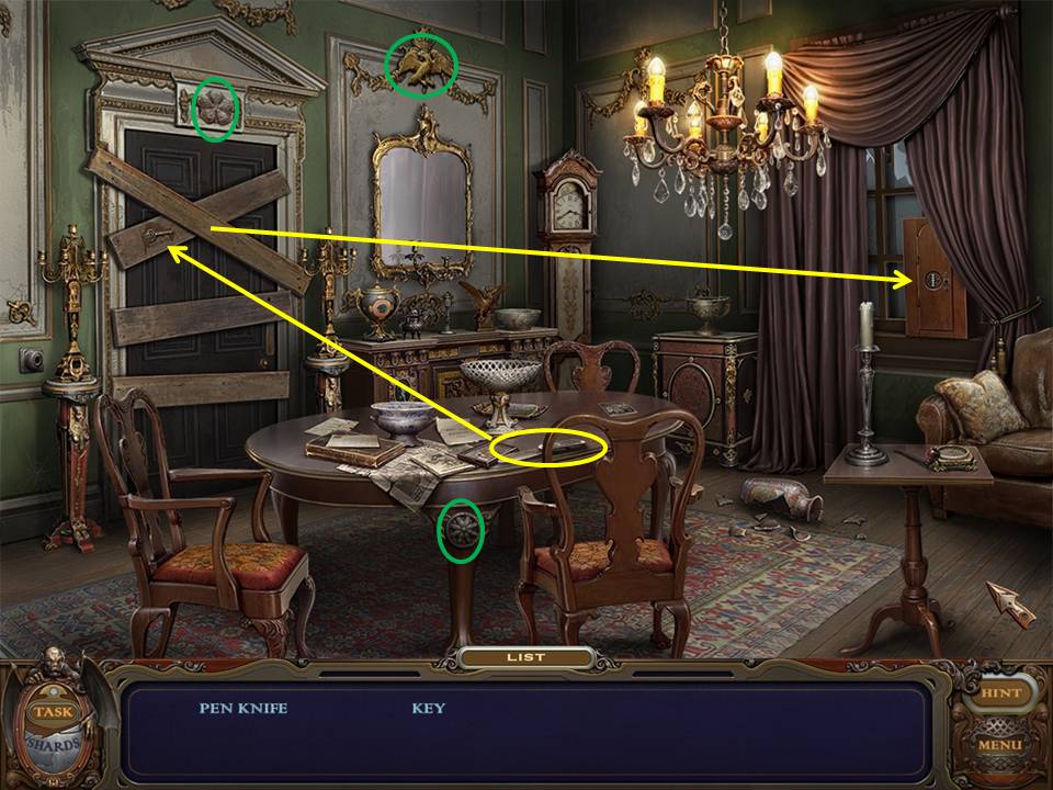 Pick up the SHARD from behind the firescreen to the left of the desk.