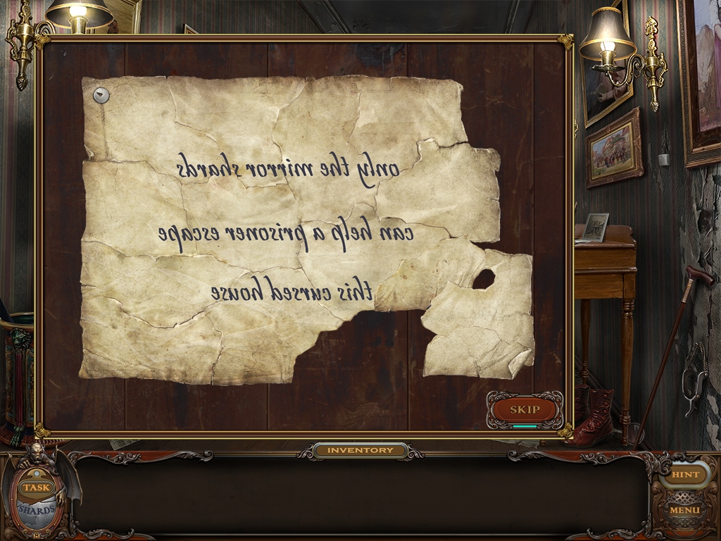 Click on the roll of paper to initiate a mini game. The object of the mini game is to assemble the pieces of a note in order to read the message. Drag and drop the pieces of the note to assemble. Use the paper's straight edges as your guide. When the note is fully assembled, you'll notice that the script is in reverse. Go back to the corridor and pick up the MIRROR located in the lower right corner of the screen to read the note. The note reads, "Only the mirror shards can help a prisoner escape this cursed house."