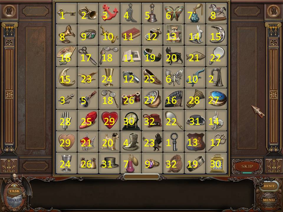 The bar across the top of the screen has a series of symbols. Moving from left to right find the matching symbol on the grid below. After you click on all of the matches (which may consist of several games), the message "Mansion is your destiny" will appear.