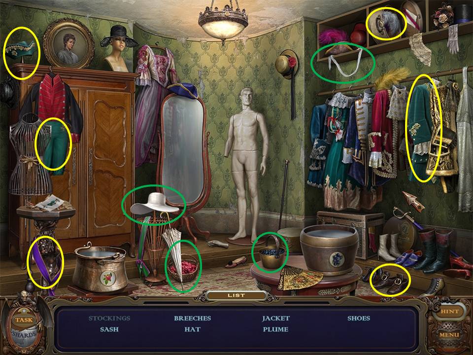 Click on the green chair to play a Hidden Object Area.