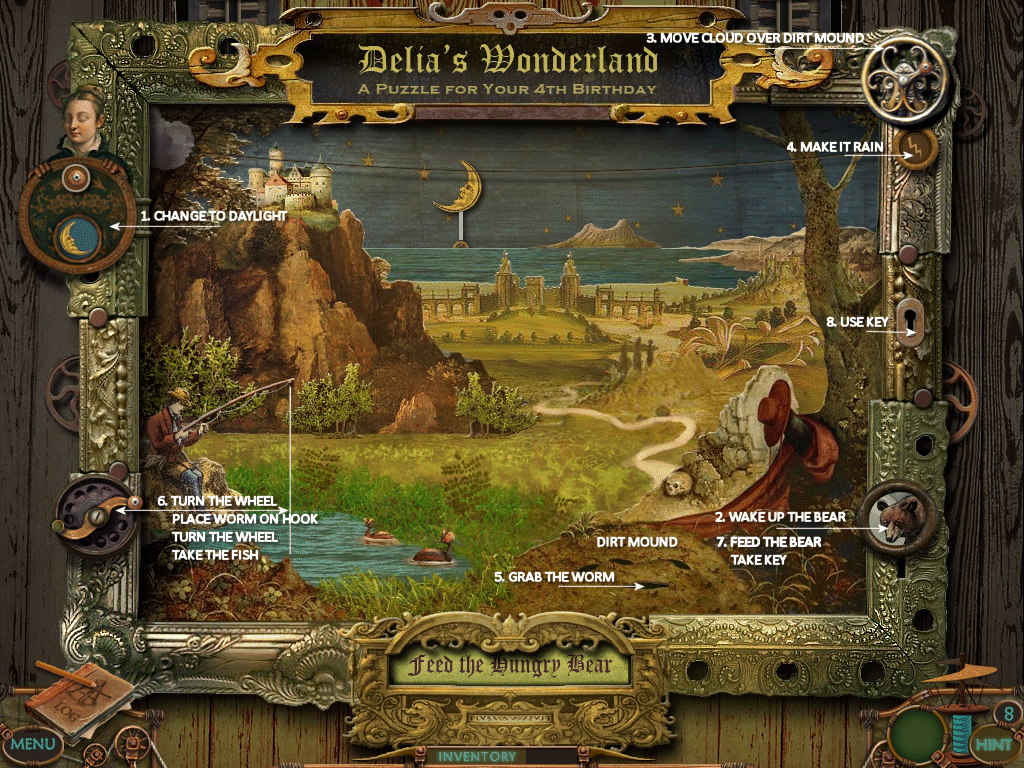 • I thought the puzzles were pretty logical, but if you're not sure you can use a hint or just click around – enjoy!