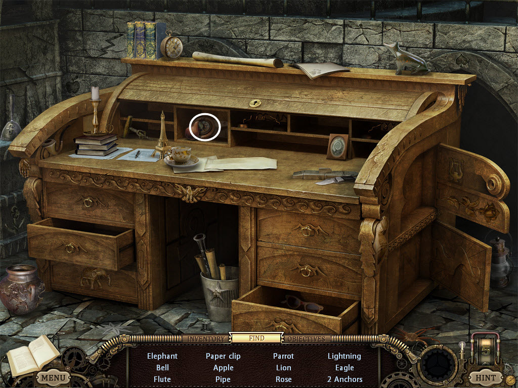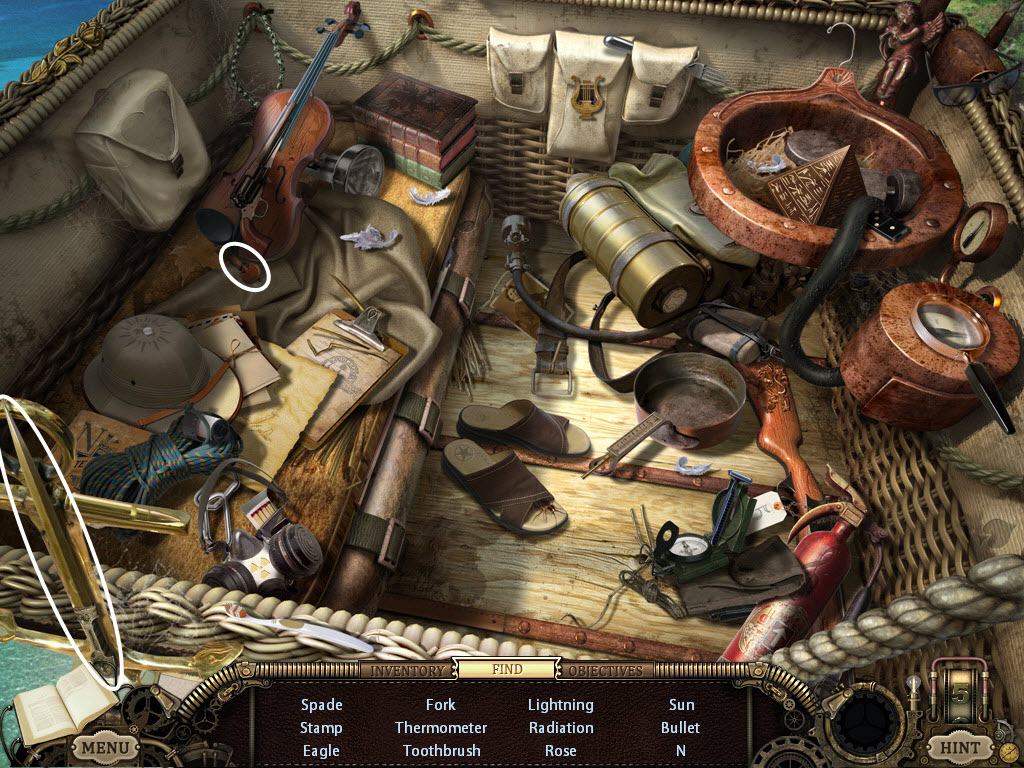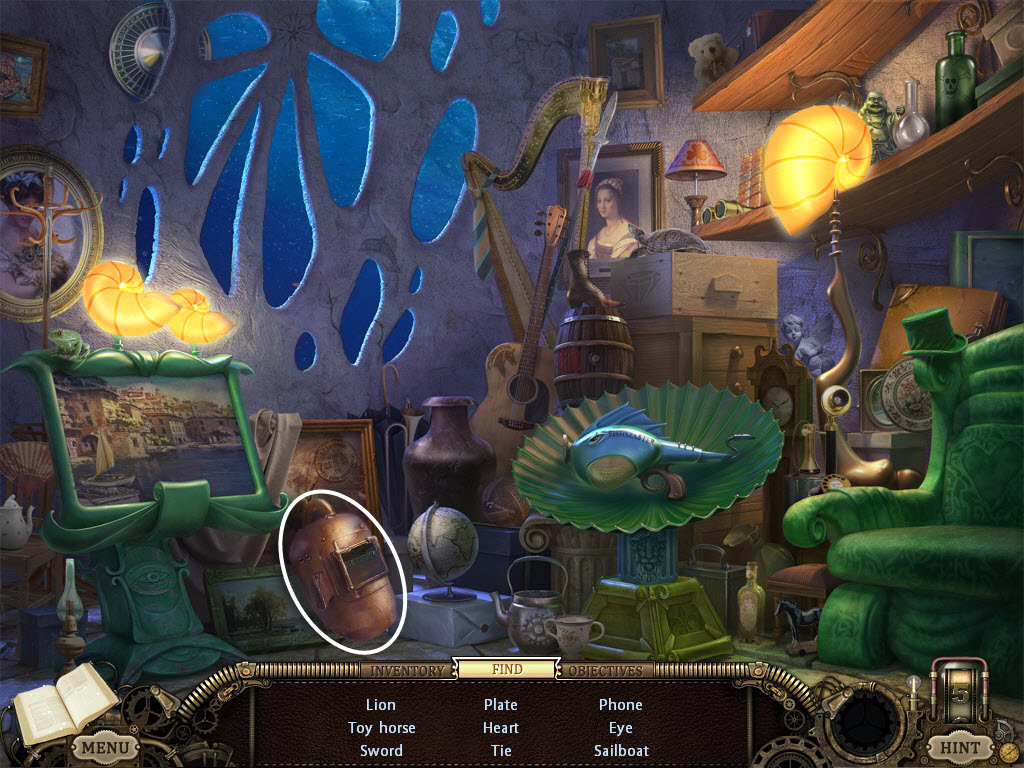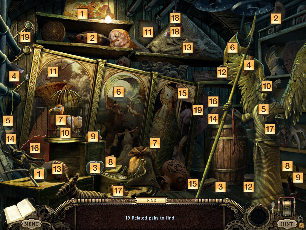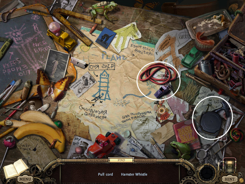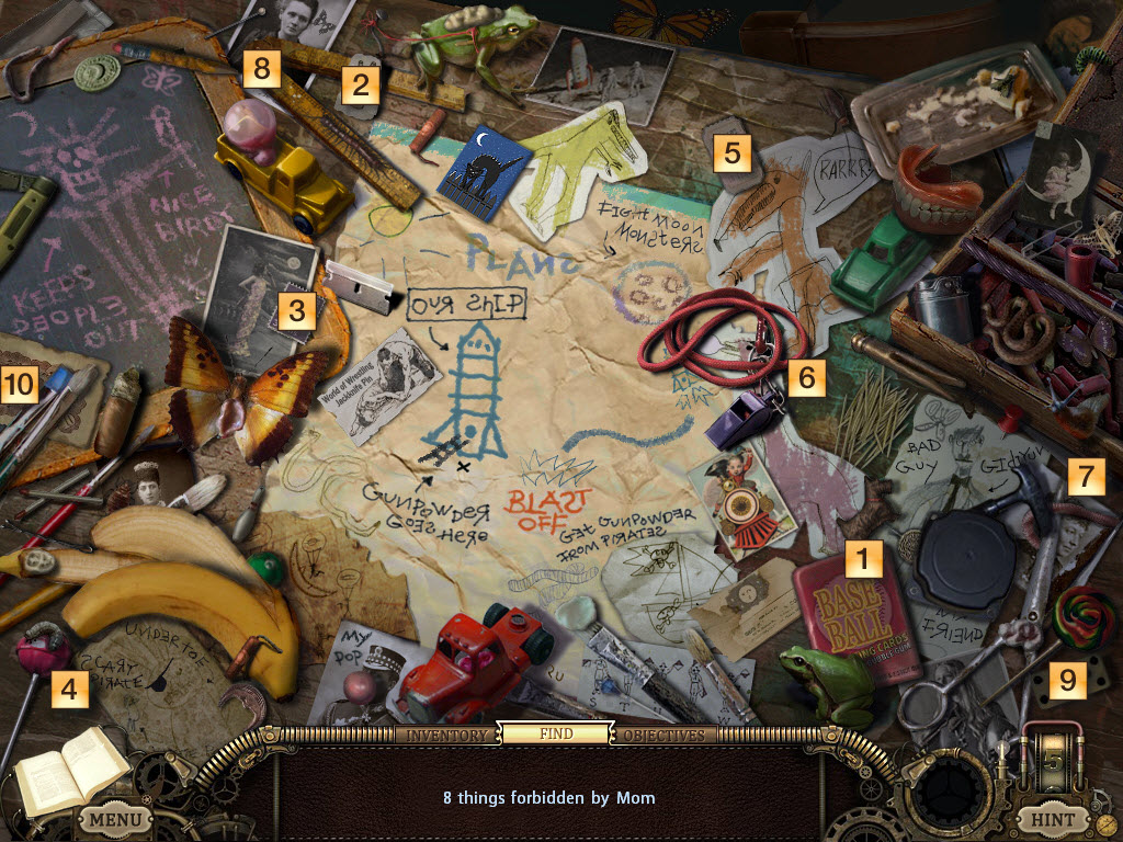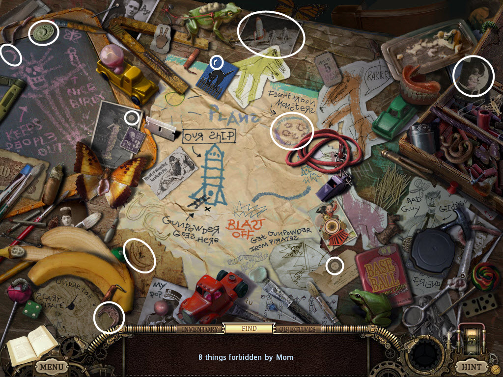 - Find - This list the objects you need to find in hidden object mode. You click an item in the list to see a silhouette.