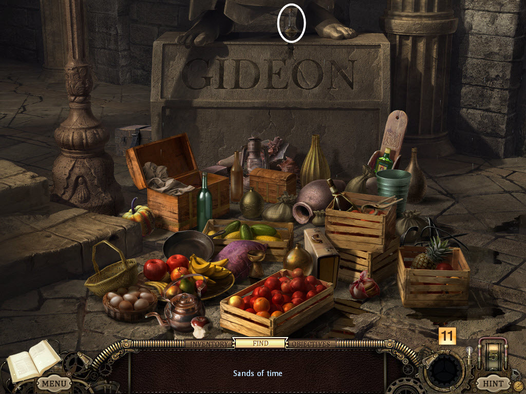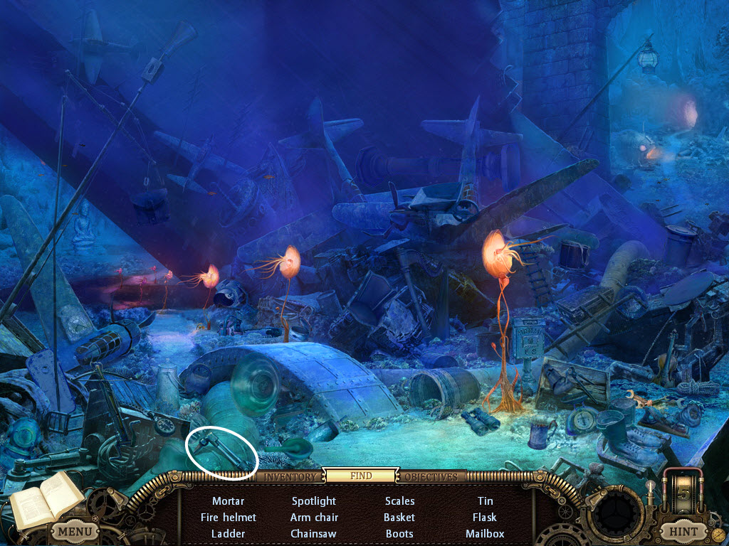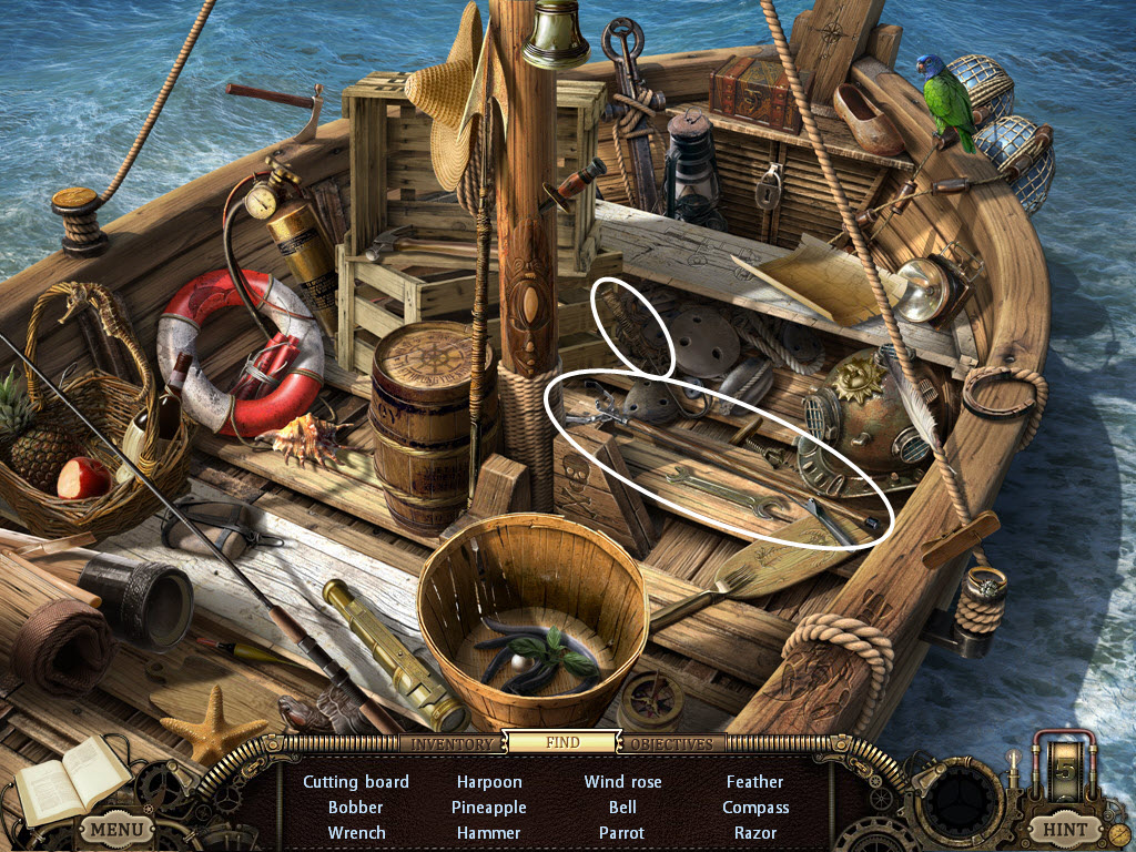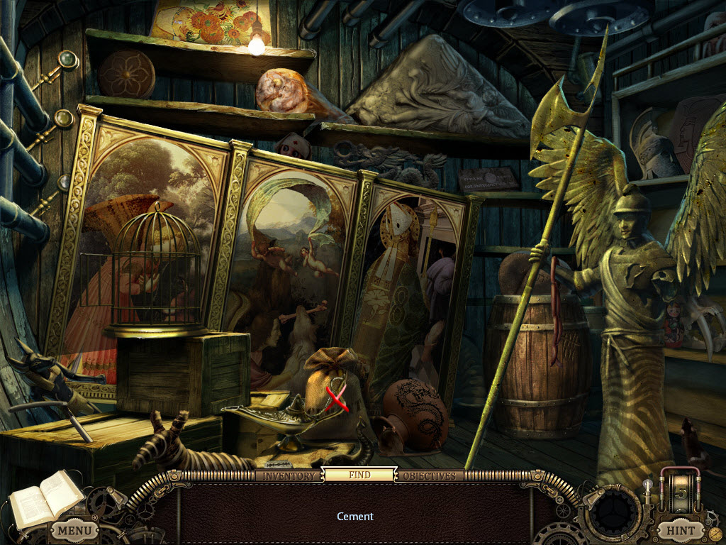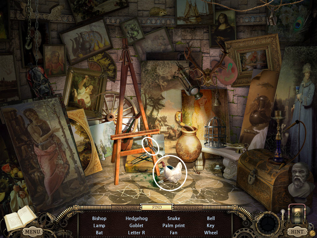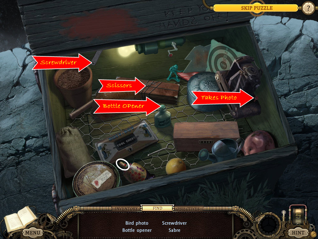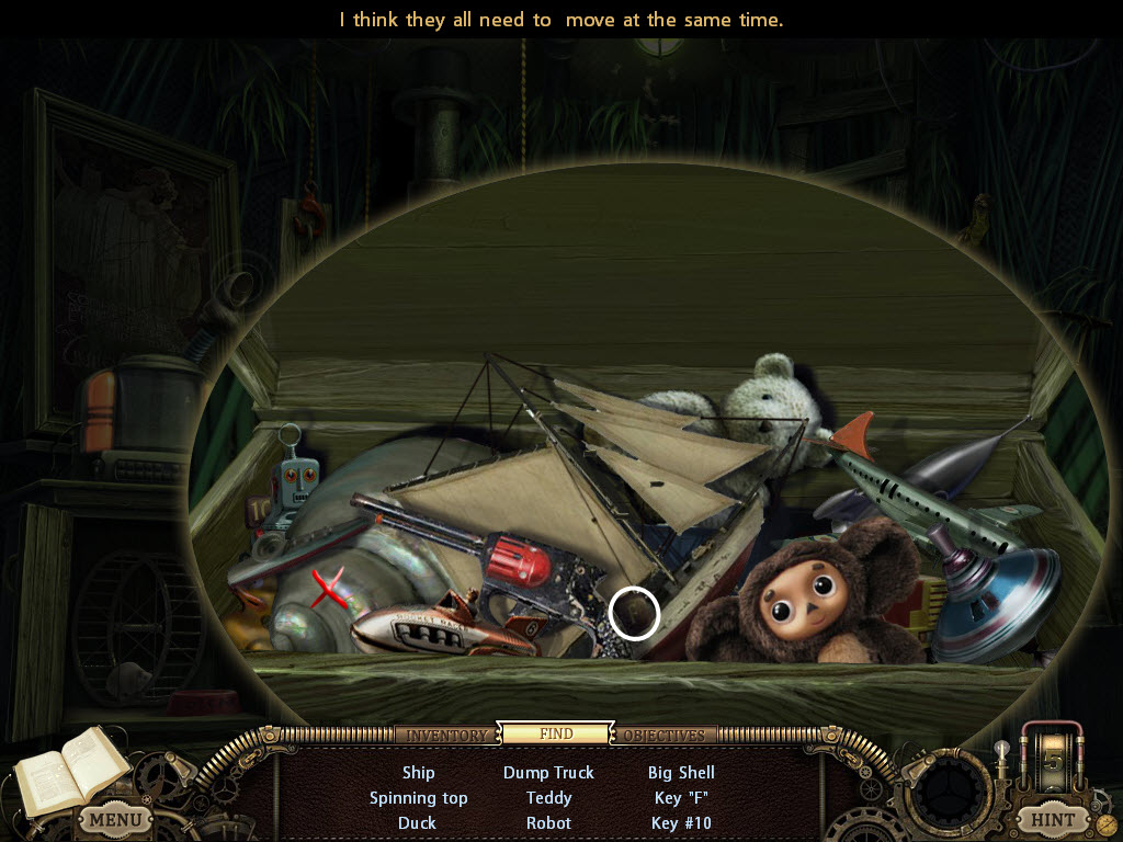 - Find - This list the objects you need to find in hidden object mode. You click an item in the list to see a silhouette.