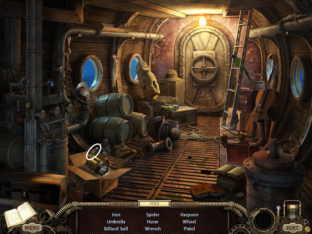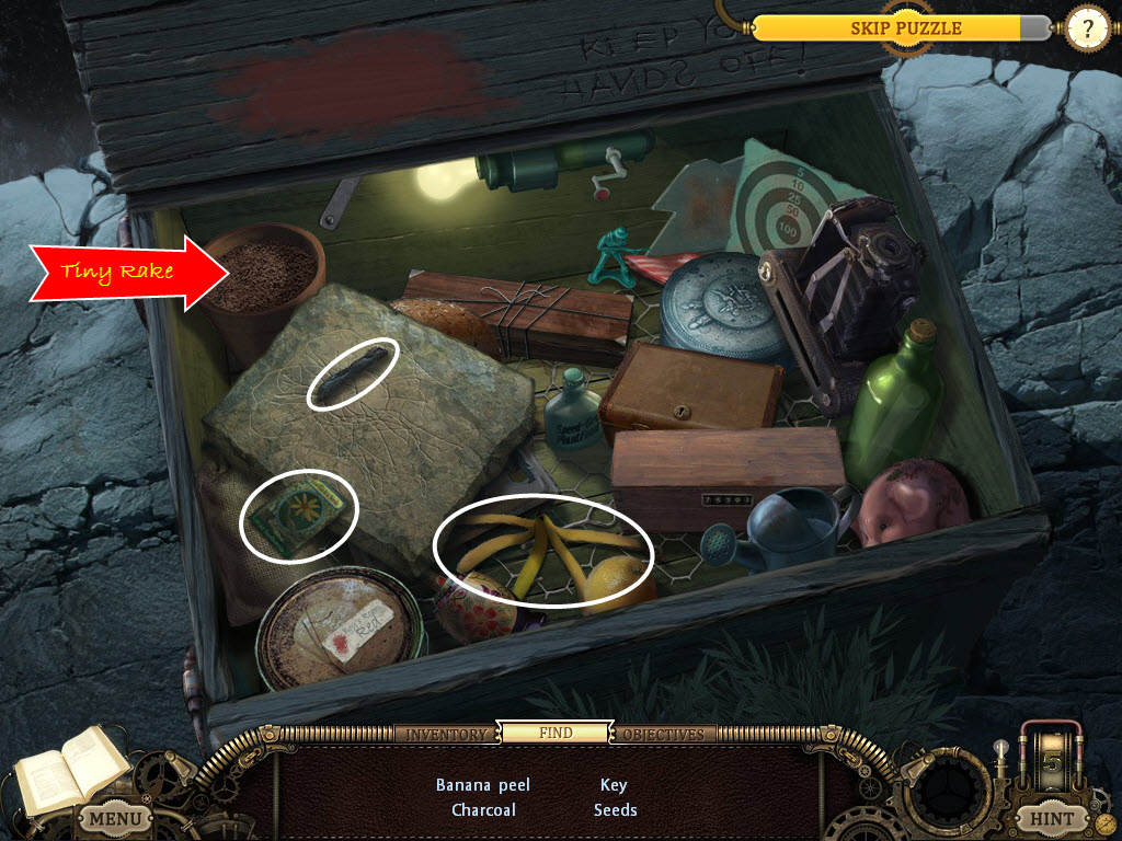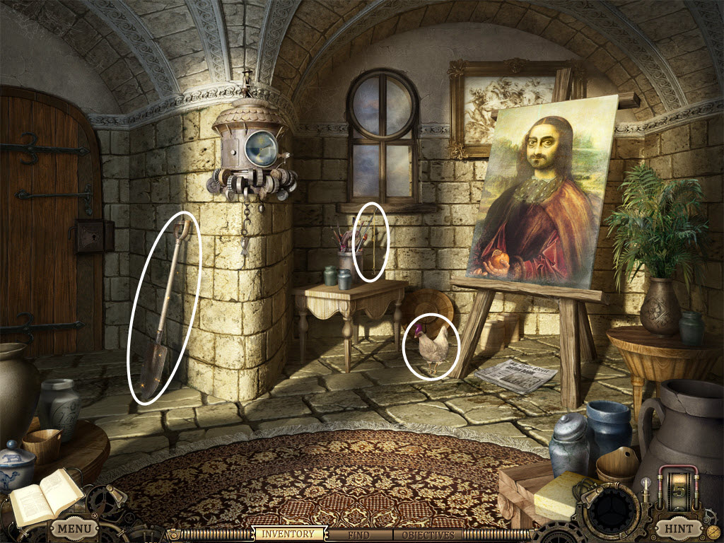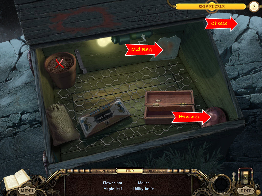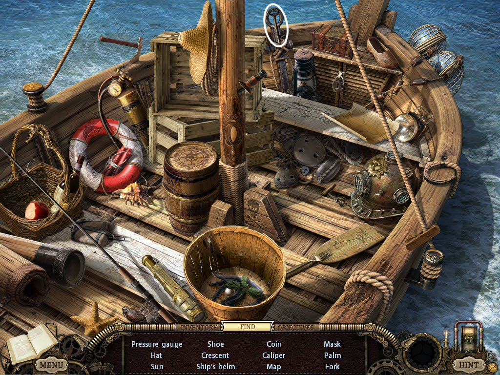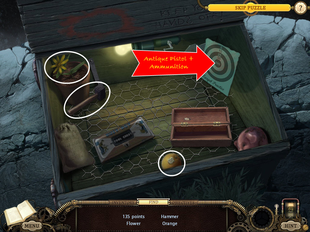 - Find - This list the objects you need to find in hidden object mode. You click an item in the list to see a silhouette.
