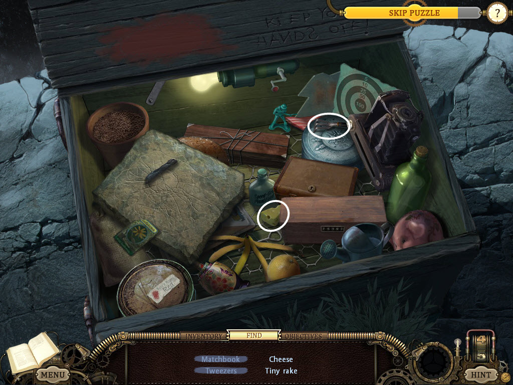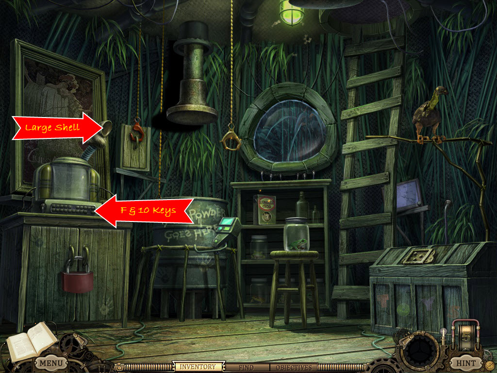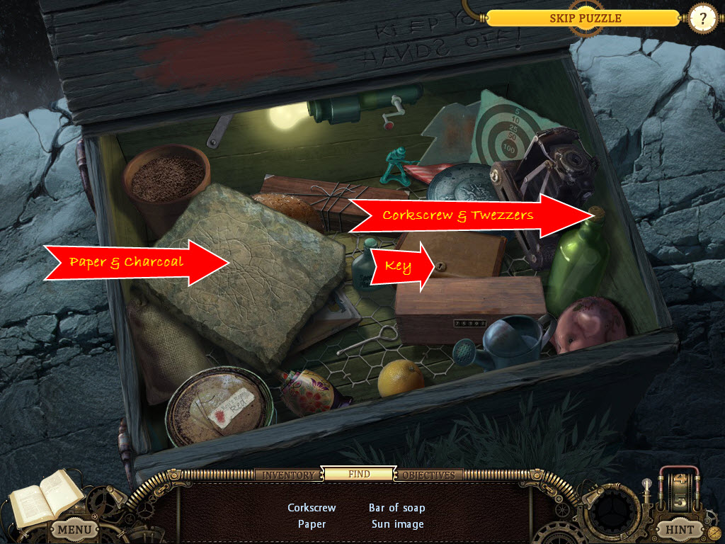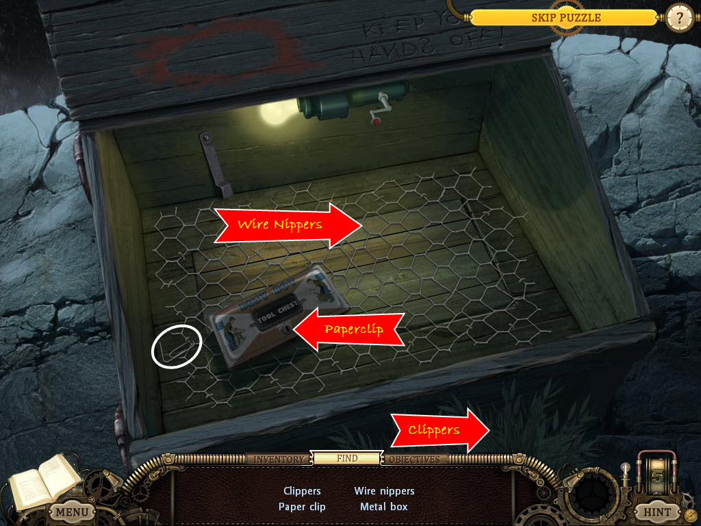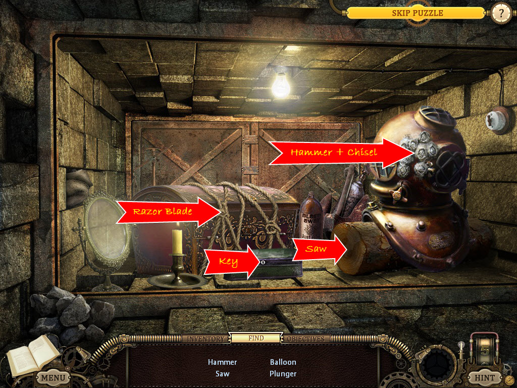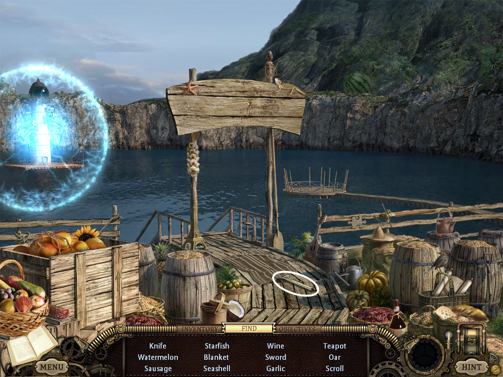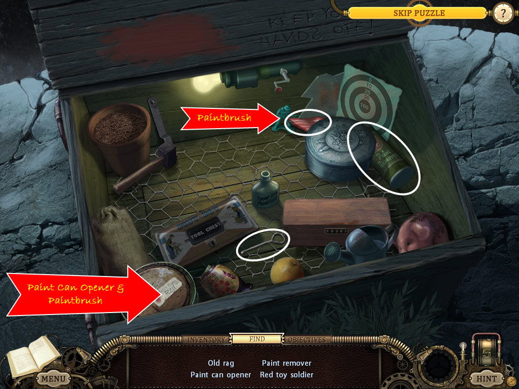 - Find - This list the objects you need to find in hidden object mode. You click an item in the list to see a silhouette.
