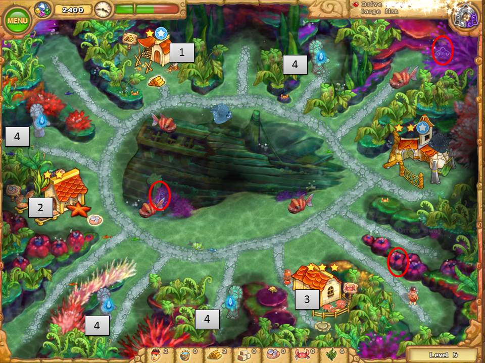 - Clear to crab farm, build and upgrade 3 times
