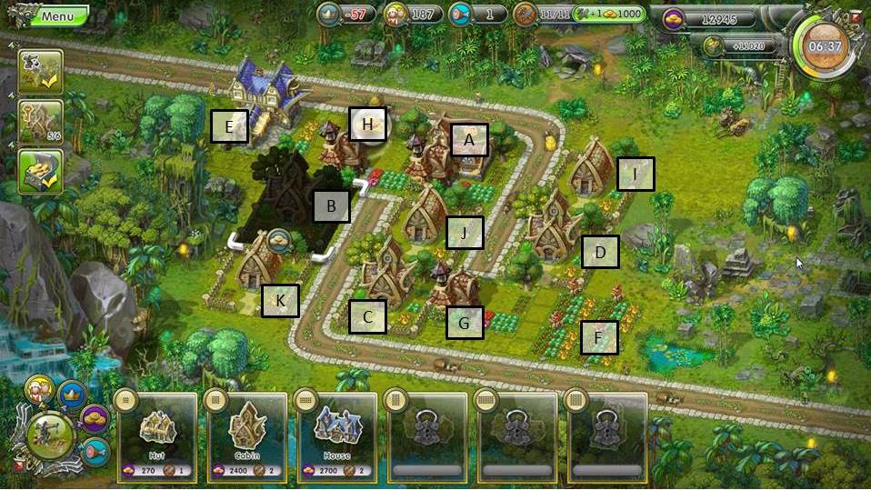 - Build 2 bakeries and upgrade luxury, next to first bakery and next to bottom two cabins touching both (G H)