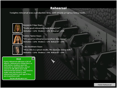 - Each action performed in the game takes up one (1) “day in the life” of your band so you’ll need to prioritize what’s important in your world.