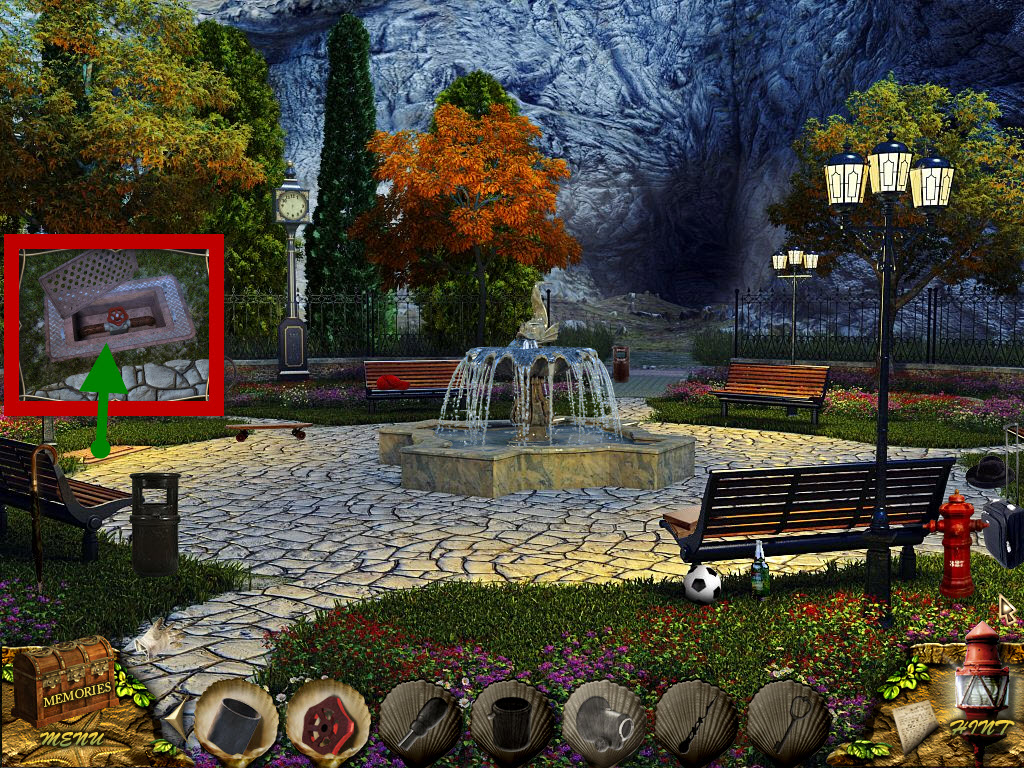 * Click on fountain, pick up minute hand out of fish mouth