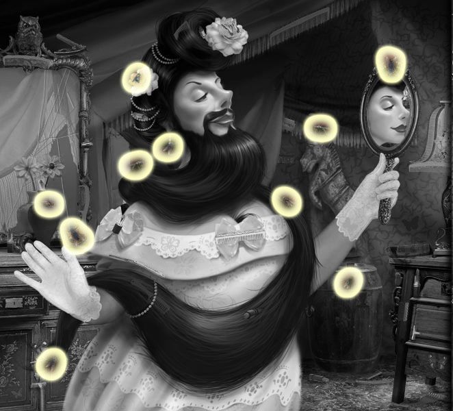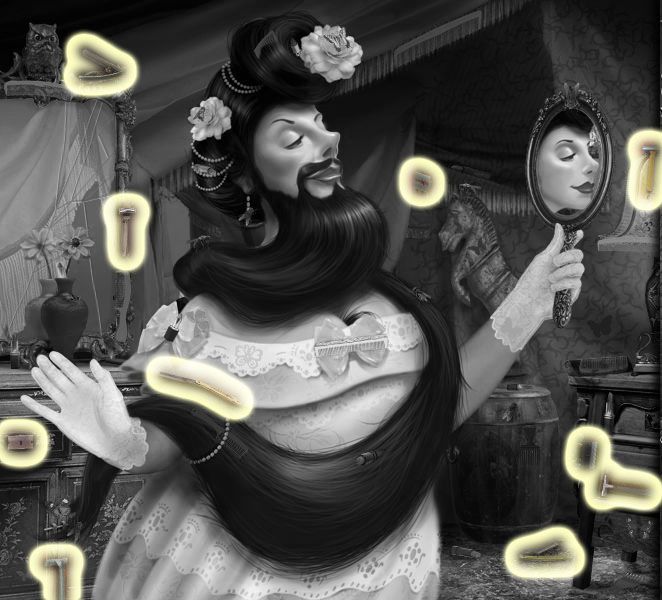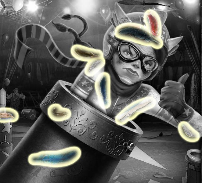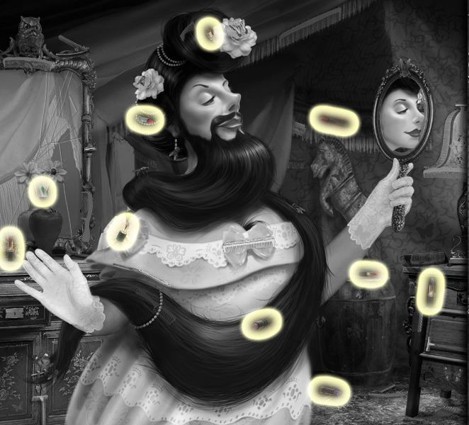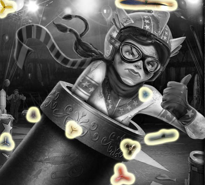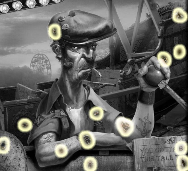 Puddle’s Puzzle: Drop the items from the clown’s pockets into the mouths above, matching their colors. Click on the clown’s nose to retract the tie, and turn the dials he’s holding until each picture displays a brown and yellow honeycomb. Click on the nose again, and the bees will come out. Match the order you take the bees back to the comb to the number of honey combs that are directly above each. Click here for a video. Dante’s Puzzle: This one is complicated. Tans’ Puzzle: You need to fill in the blank. First, complete the switch by dragging the bottom half of it to the top half. Hit the switch. Then weigh the letters from left to right on the balancing pole to make sure they balance. Do this backwards, since you’ll end up putting the letters in backwards. Click on the satellite dish to get letters. Click here for a video. Your Fate Revealed: You need to move the puzzle pieces from the right to the left, matching all the edges. Mysterious, Changing Items (Once they’re gone, they’re GONE.) The Amazing Larry: The lock on the water “closet.”