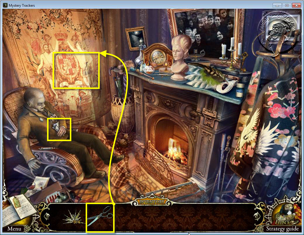 - Use the SCISSORS on the tapestry to reveal what's behind it.