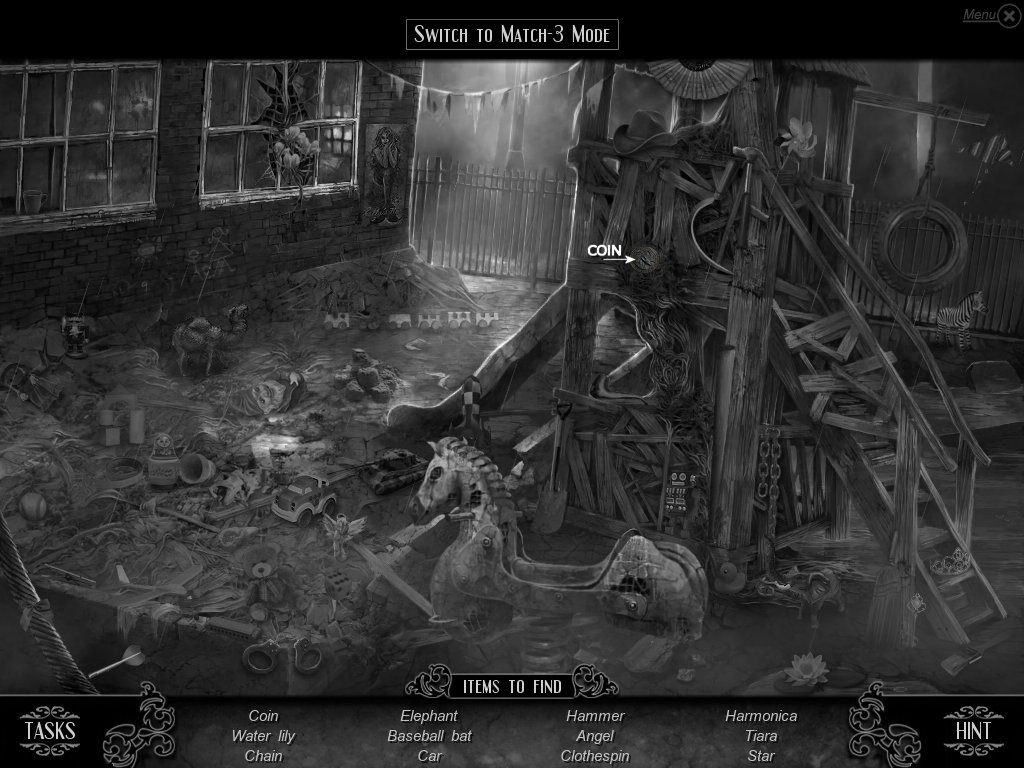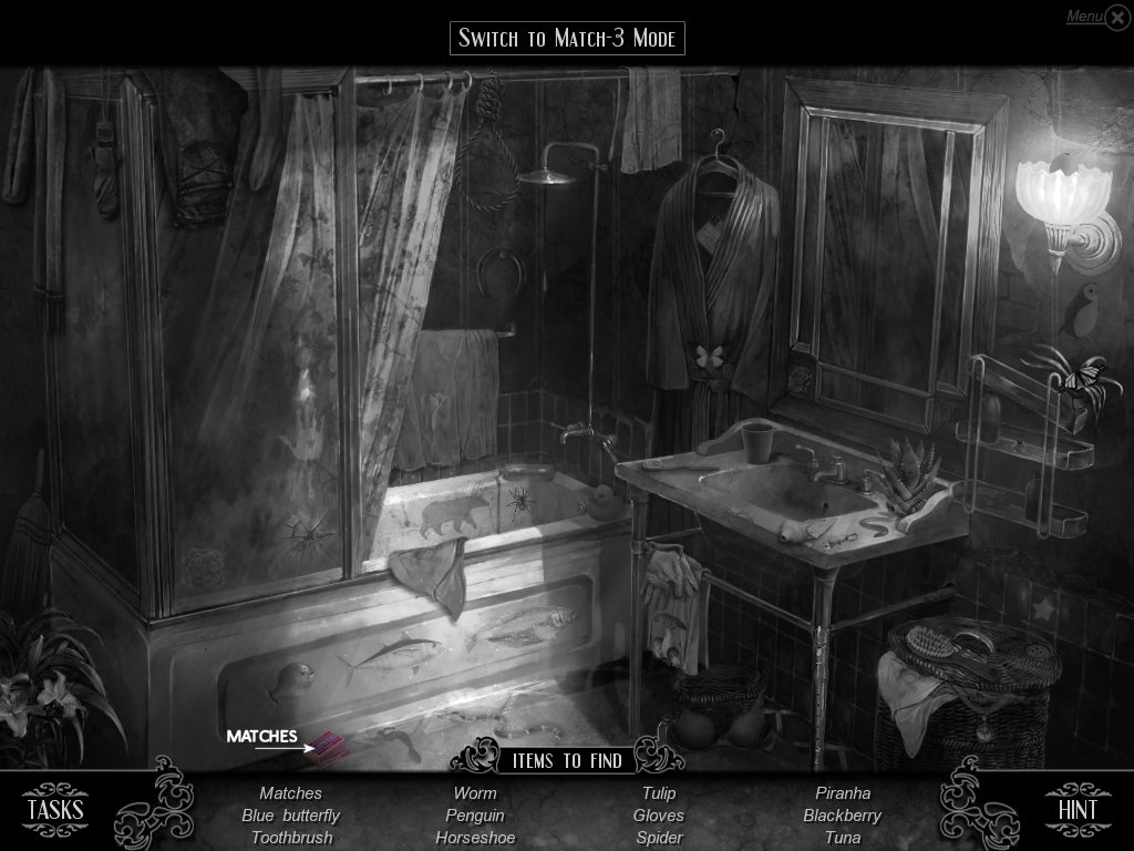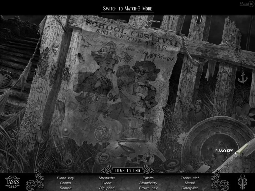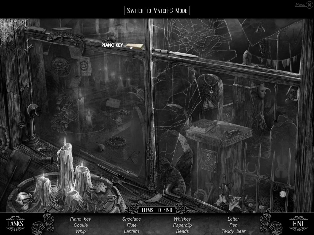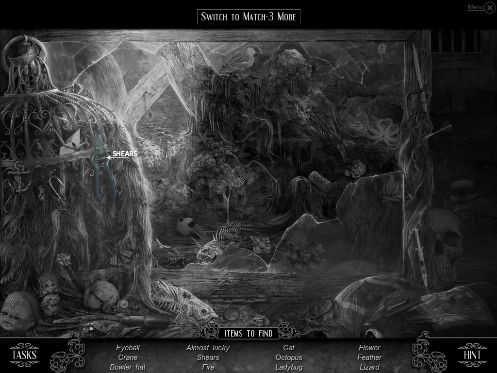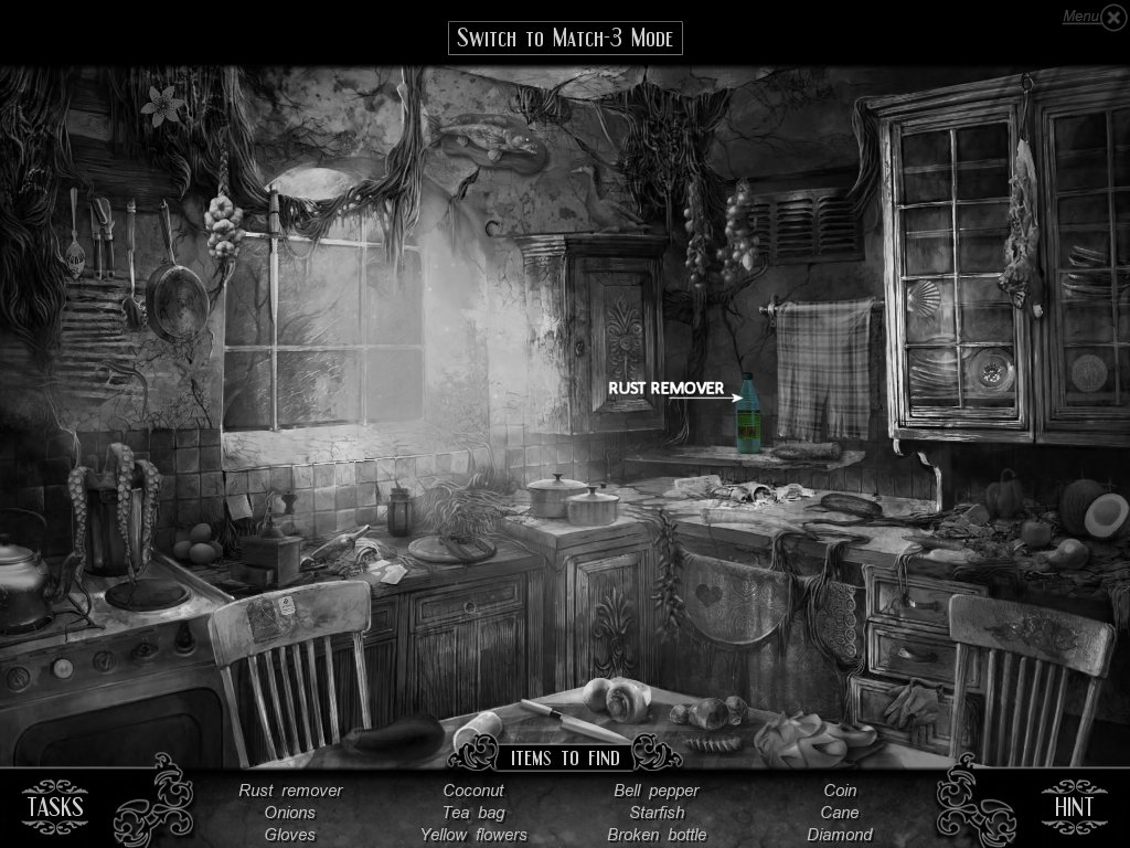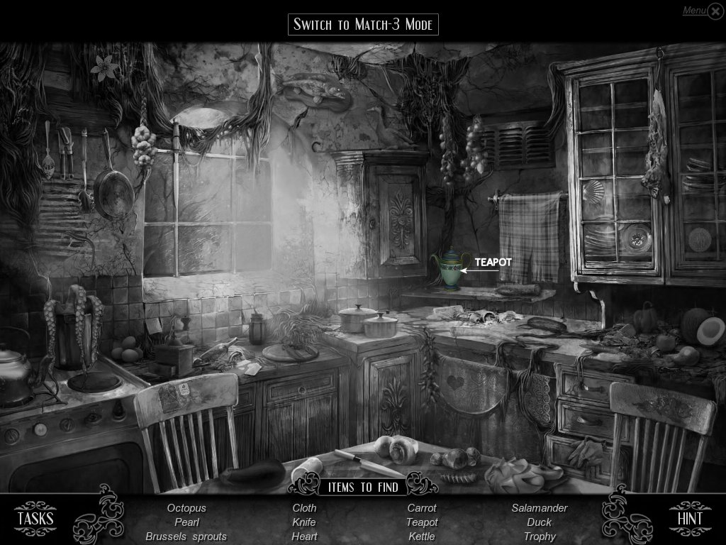 Hidden Object & Match-3: When you are in hidden object mode, you will notice a "switch to Match-3" at the top. By doing so, you can play a match-3 game. When certain objects are cleared from he board, it will automatically find hidden objects on your list. This is a great feature if you are stuck and have no hint handy. Hidden object areas are triggered by an event.