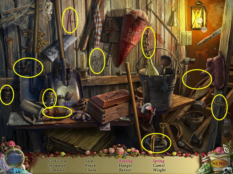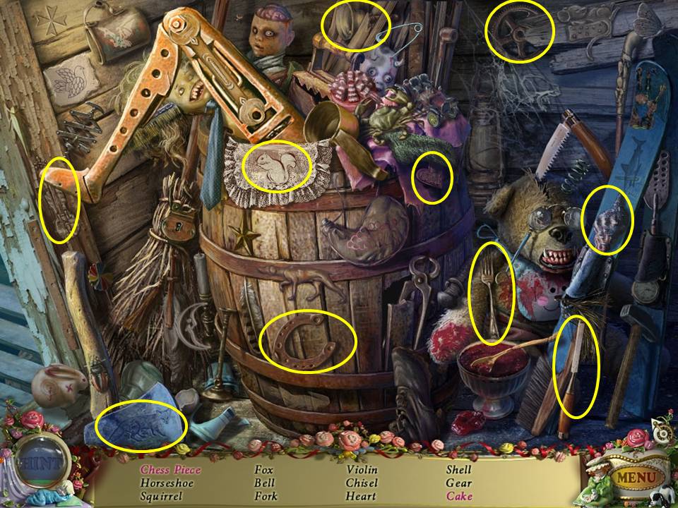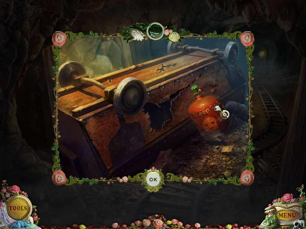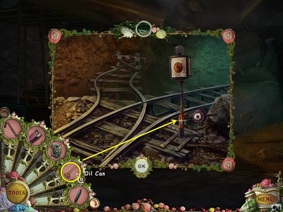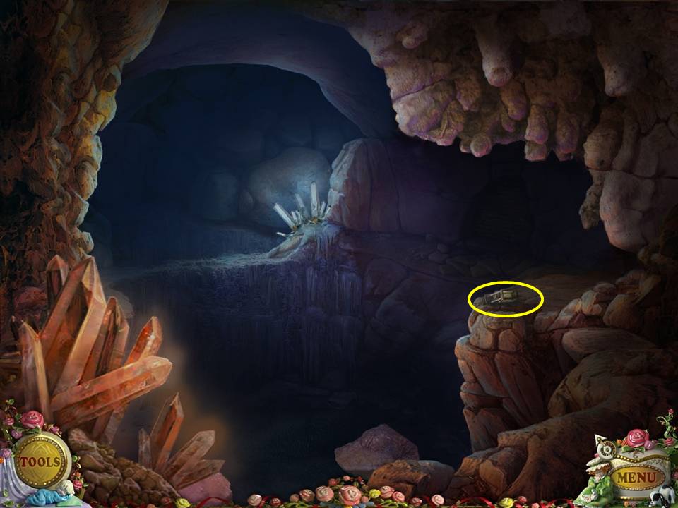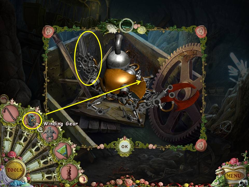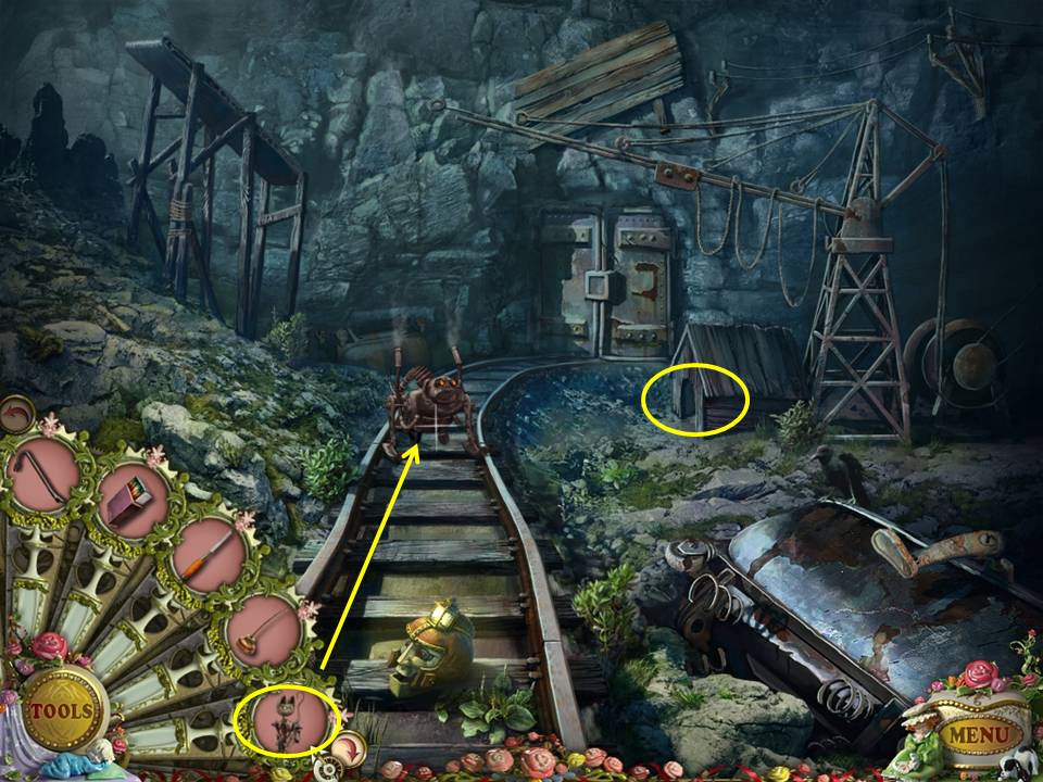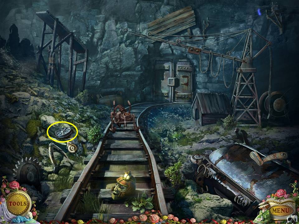 Enter the Mine through the hole on the right. Move right toward the tracks. Zoom into the cart on the lower right. Place the SCISSORS and the WINDING GEAR on the mechanical crab. Follow the mechanical crab through the fence. Click on the area to the right of the hole in the fence to initiate a Hidden Object Area.