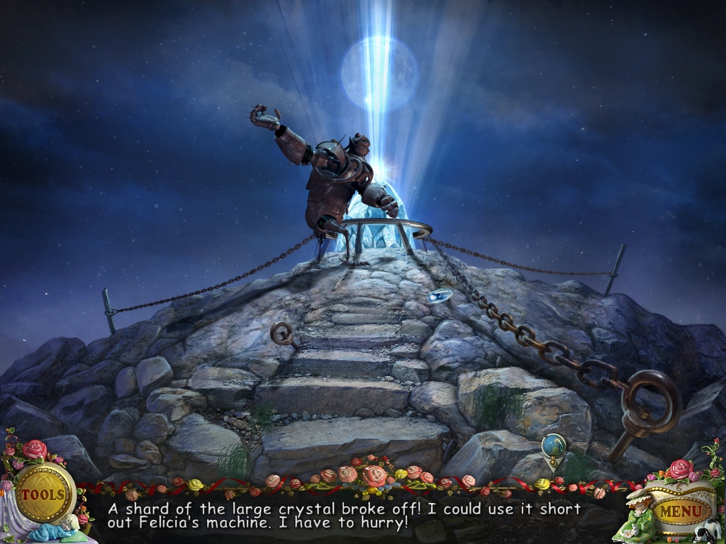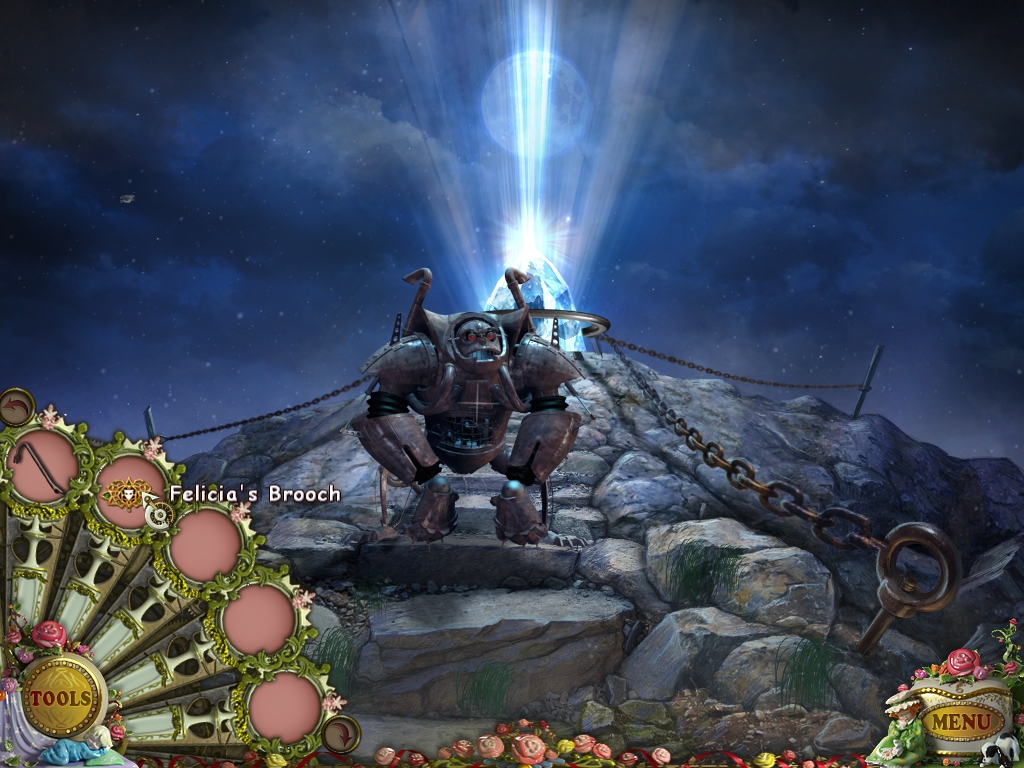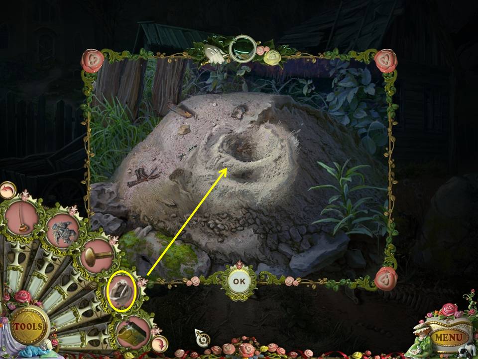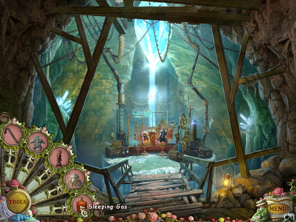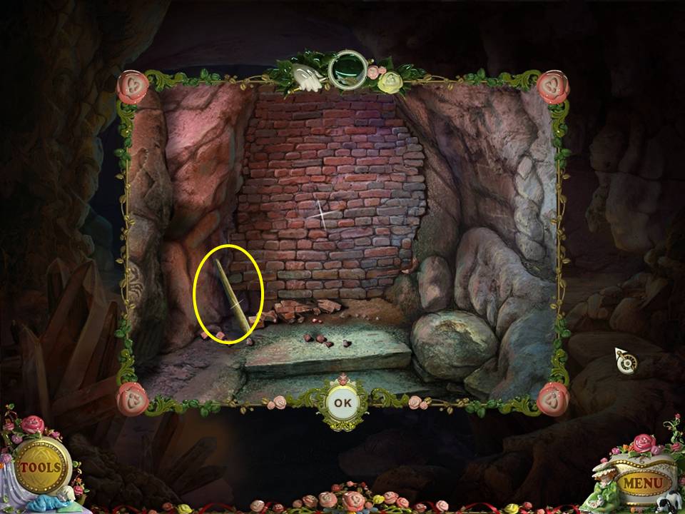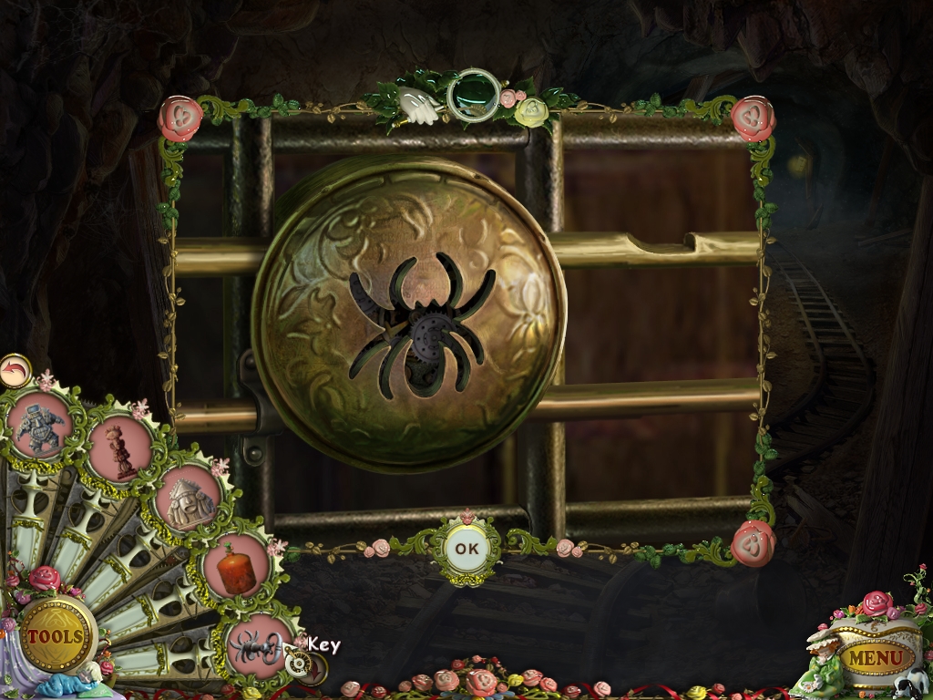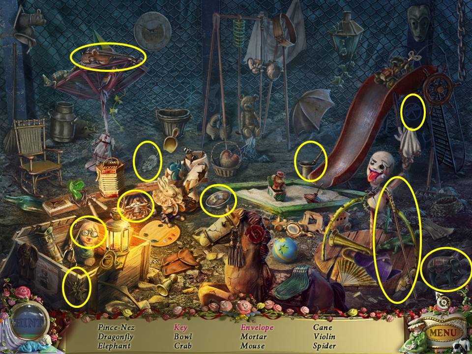 Enter the Mine through the hole on the right. Move right toward the tracks. Zoom into the cart on the lower right. Place the SCISSORS and the WINDING GEAR on the mechanical crab. Follow the mechanical crab through the fence. Click on the area to the right of the hole in the fence to initiate a Hidden Object Area.