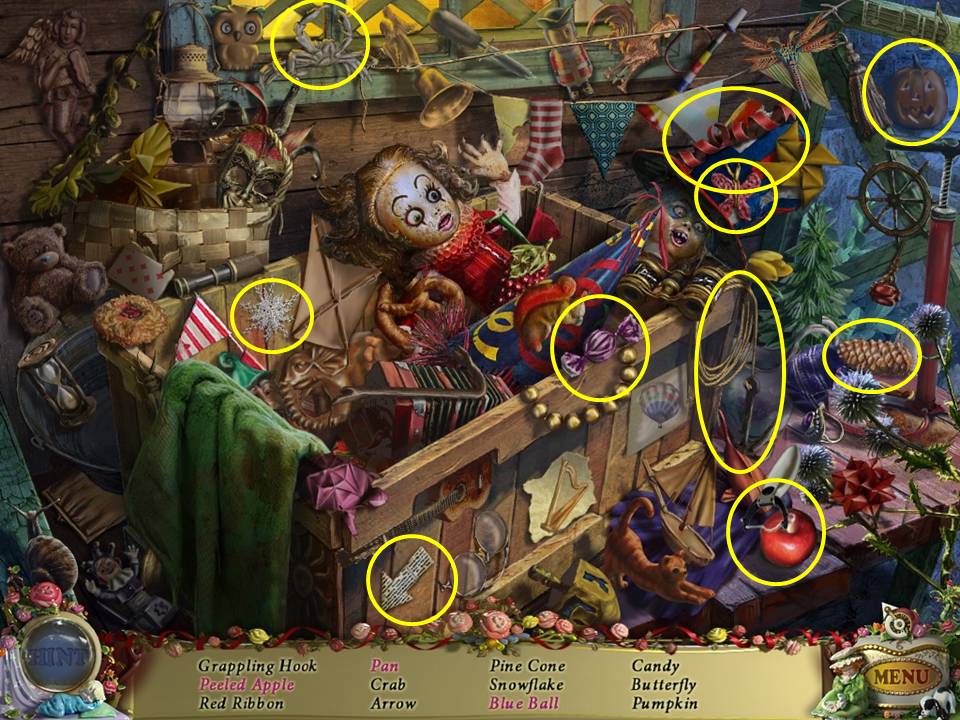 Find the items listed. Move the towel to pick up the pan. Click on the apple with peeler to obtain the peeled apple. Click on the pump to make it inflate the blue ball. Receive the GRAPPLING HOOK. Return to the first scene.
