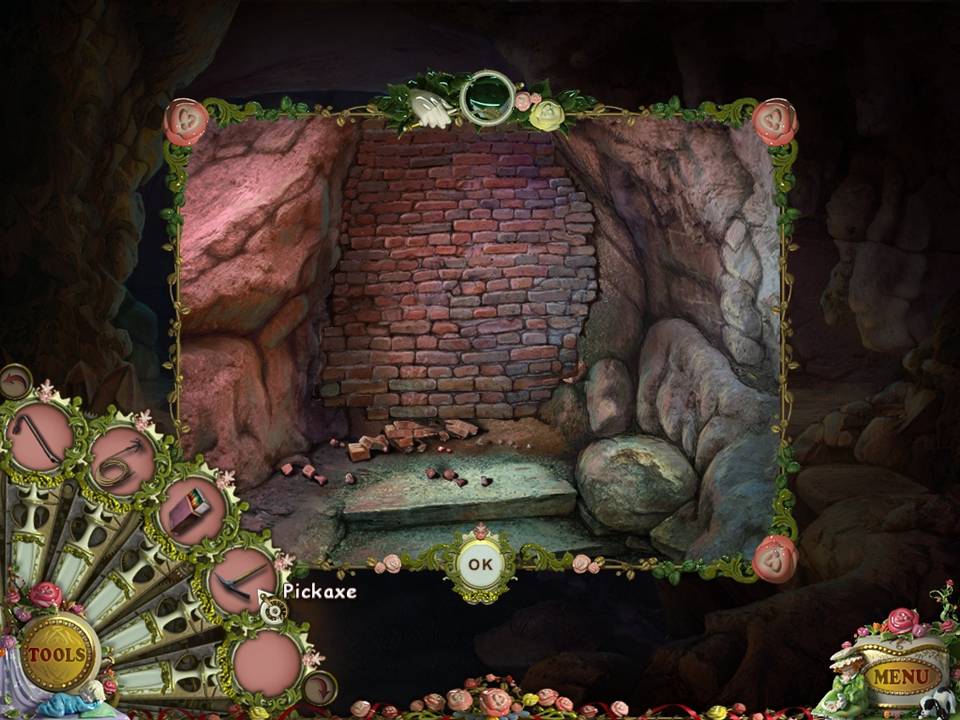 Zoom into the brick wall on the right. Break the wall with the PICKAXE. Proceed through the opening in the wall.