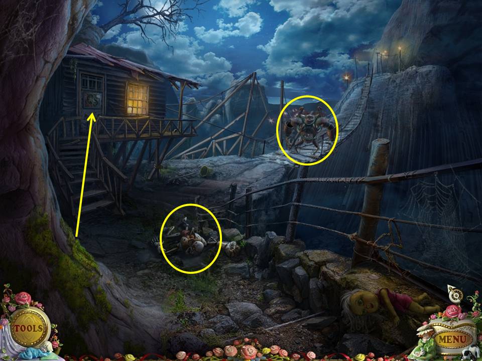 Proceed forward into town and click on the house at the top of the stairs on the right. Zoom into the small table on the left side of the porch. Take the PUPPET on the left with the green bow on its head. Click down twice and zoom into the house with the âWelcomeâ sign located on the left of the screen.