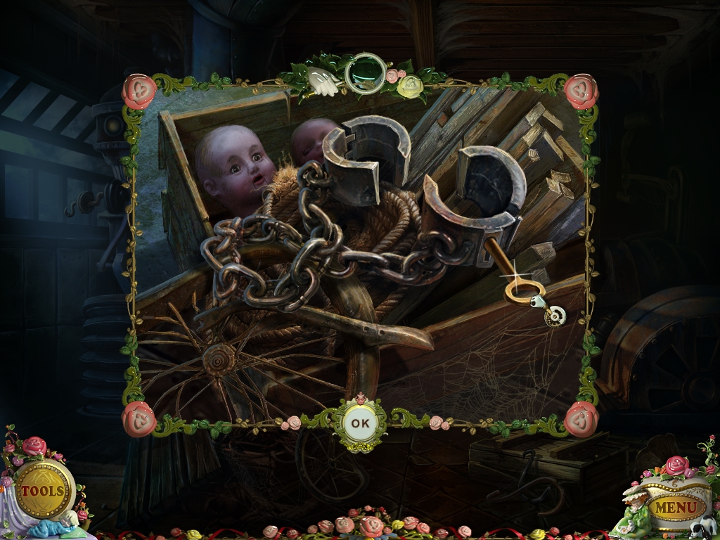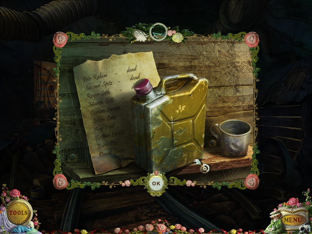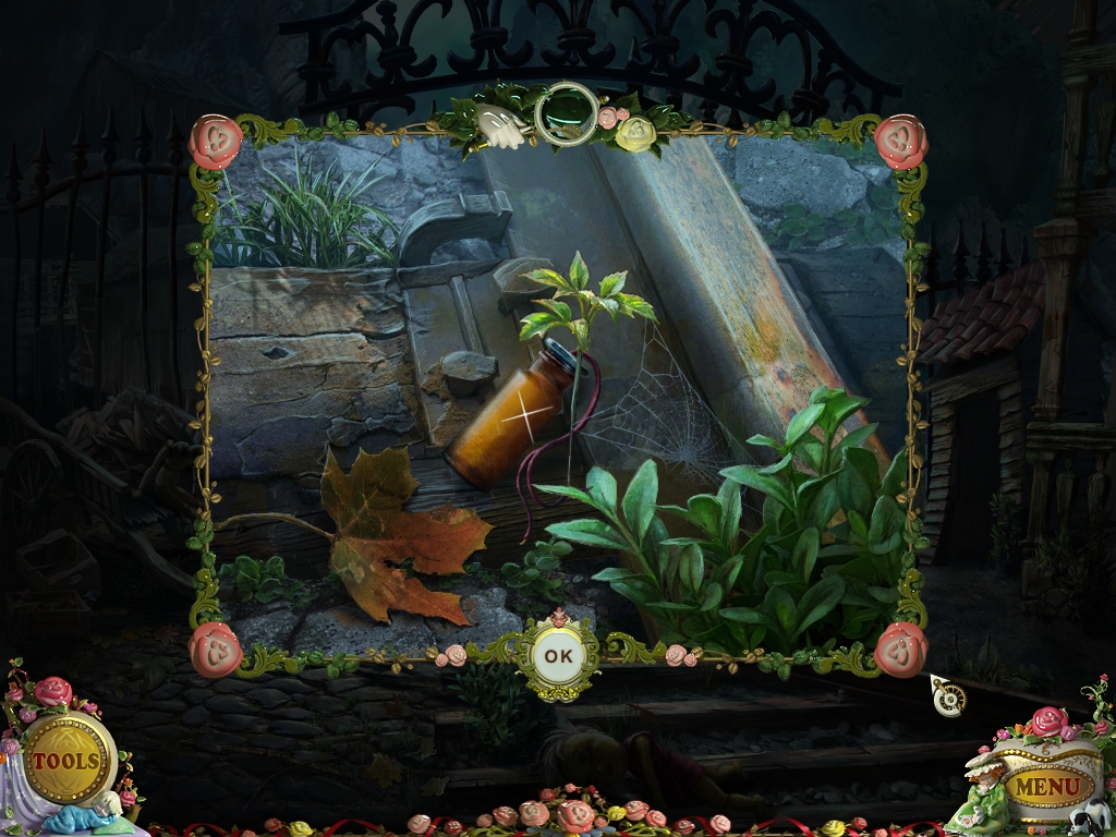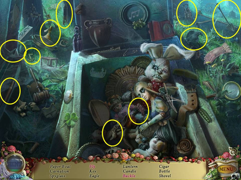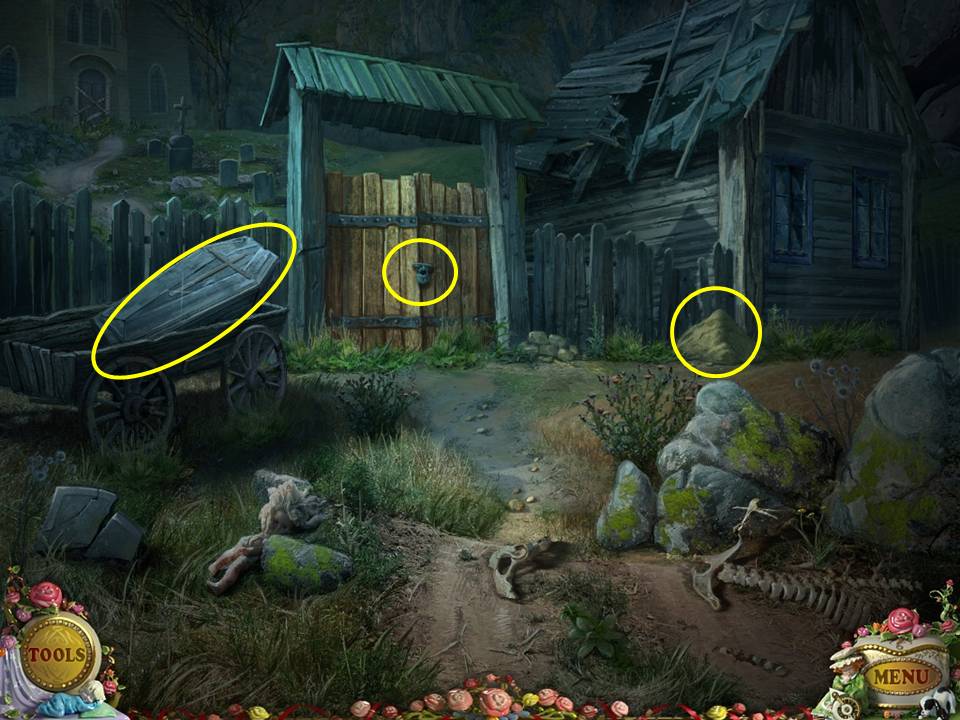 Zoom into the fence and unlock it with the CEMETERY KEY. Proceed through the gate and into the cemetery. Lift the cover off the coffin on the left to initiate a Hidden Object Area.