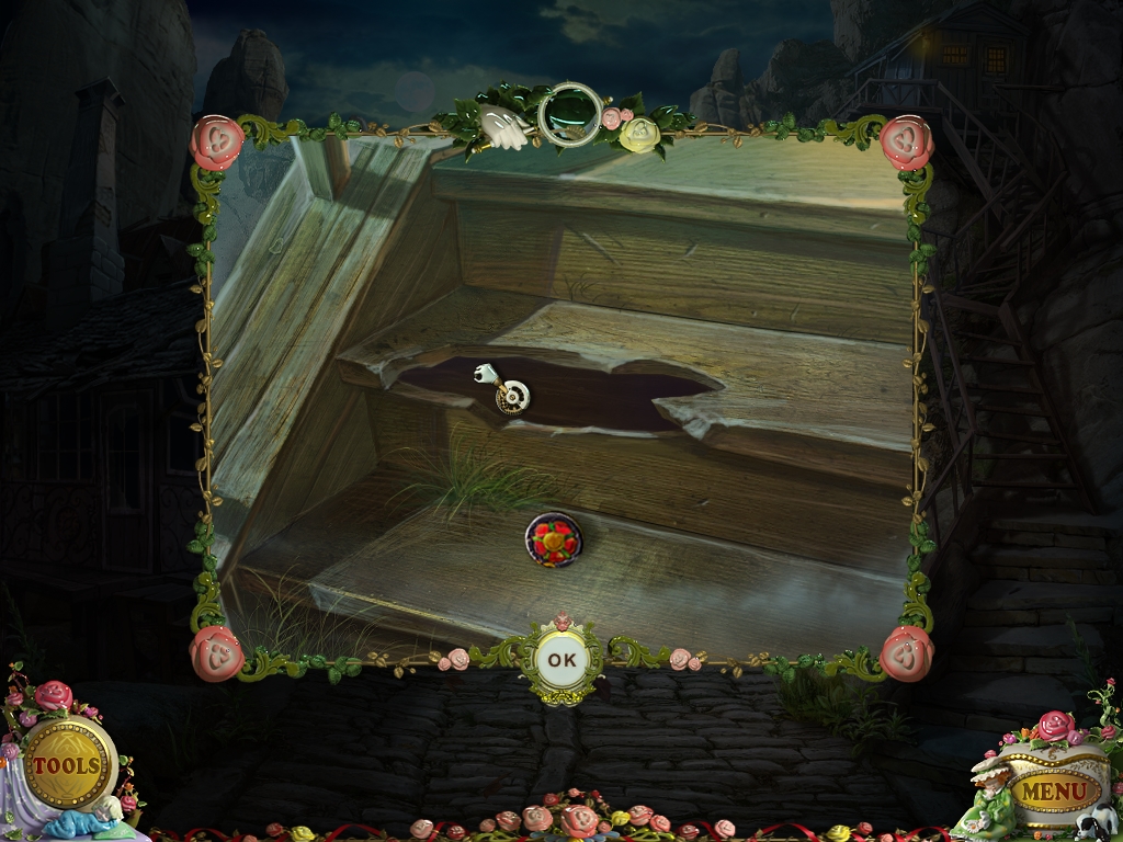 Zoom into the door on the large building in the back. Insert the COAT OF ARMS PIECE in the door. Enter the Estate. Click on the steps, which will crumble and activate a Hidden Object Area for you to play.