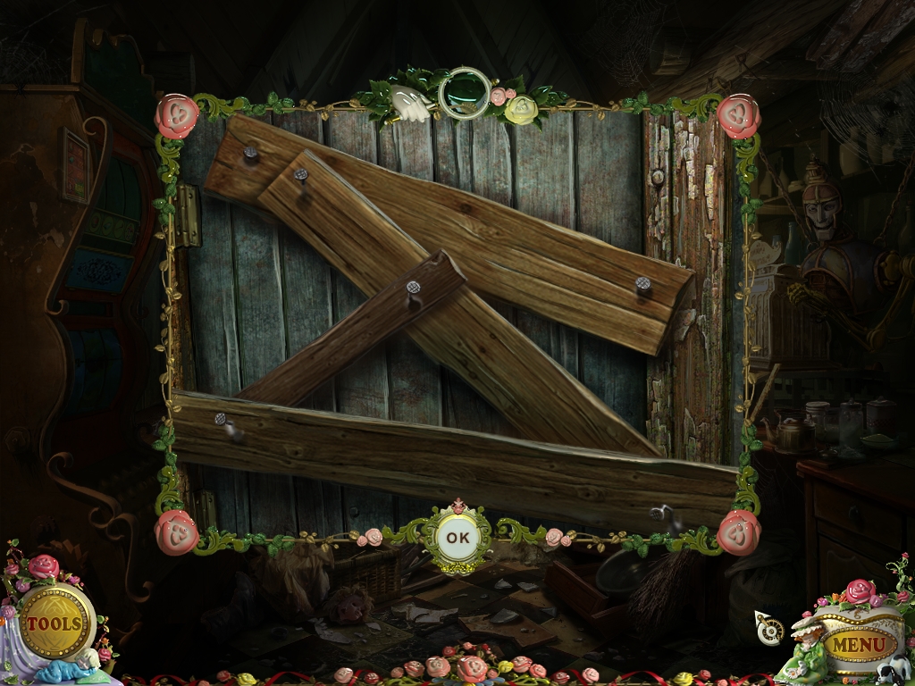 Zoom into the back door. Starting with the outermost board, use the crowbar to remove the 4 boards and to activate a Hidden Object Area.