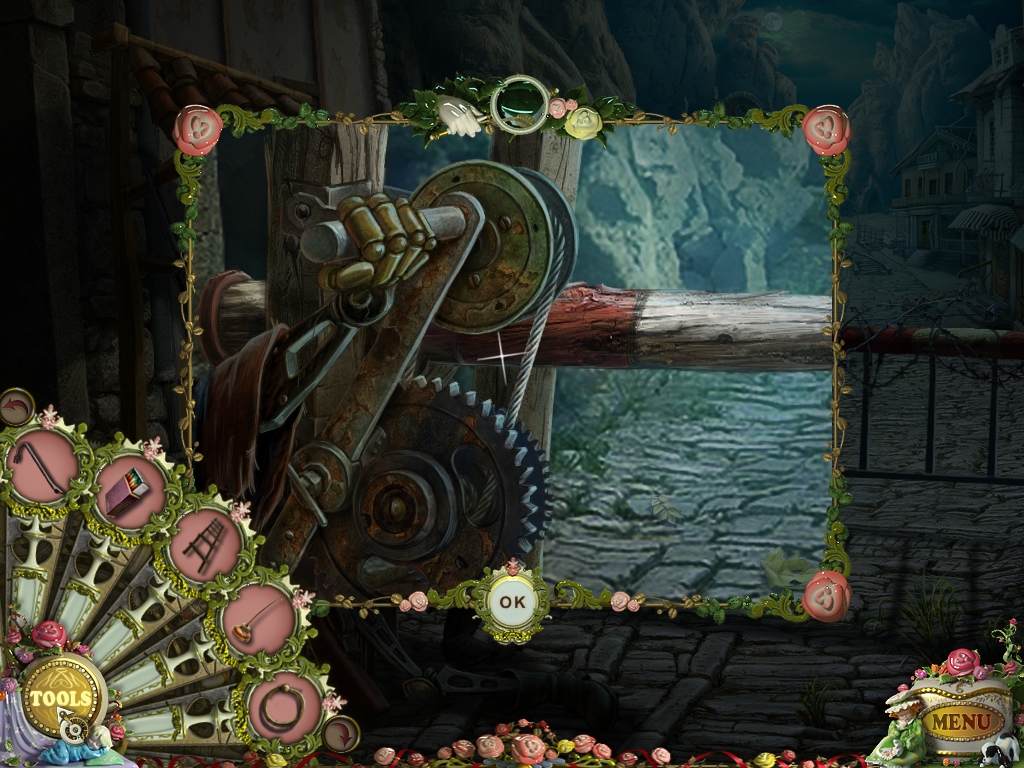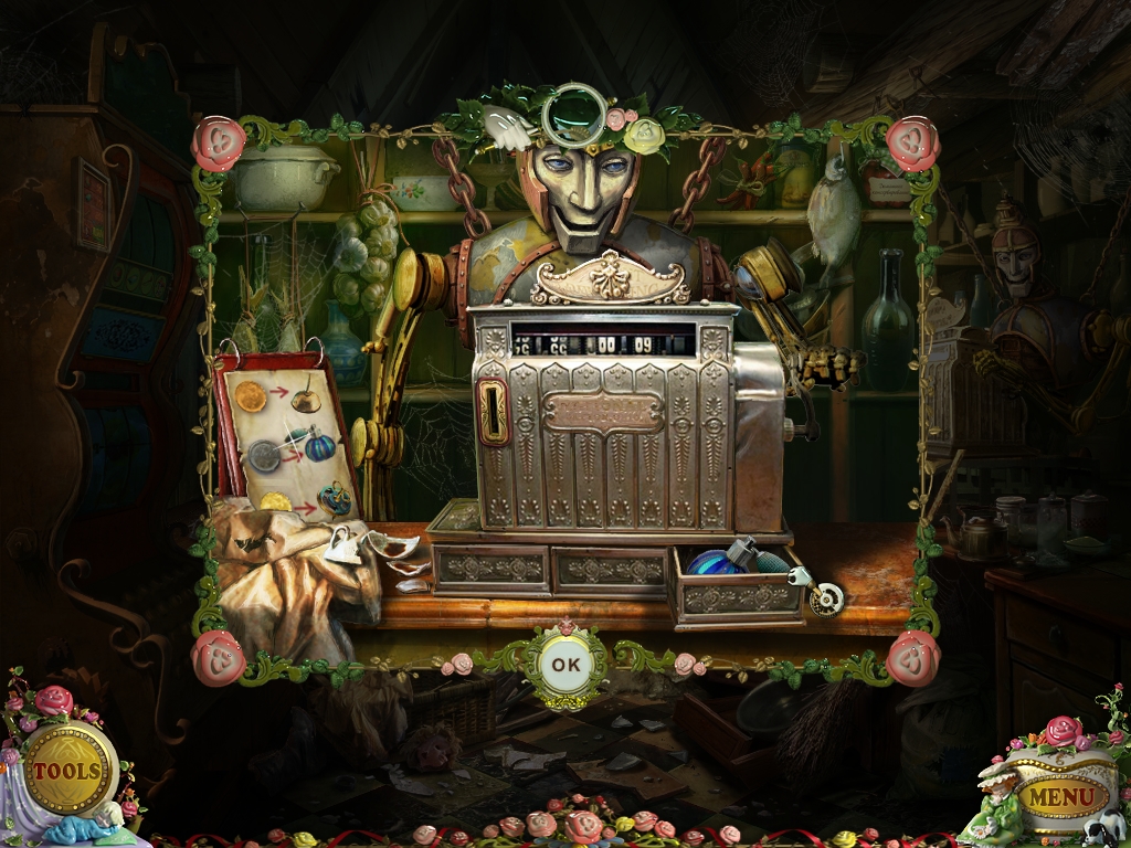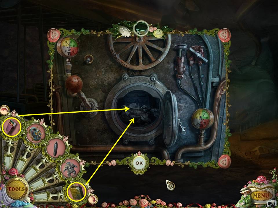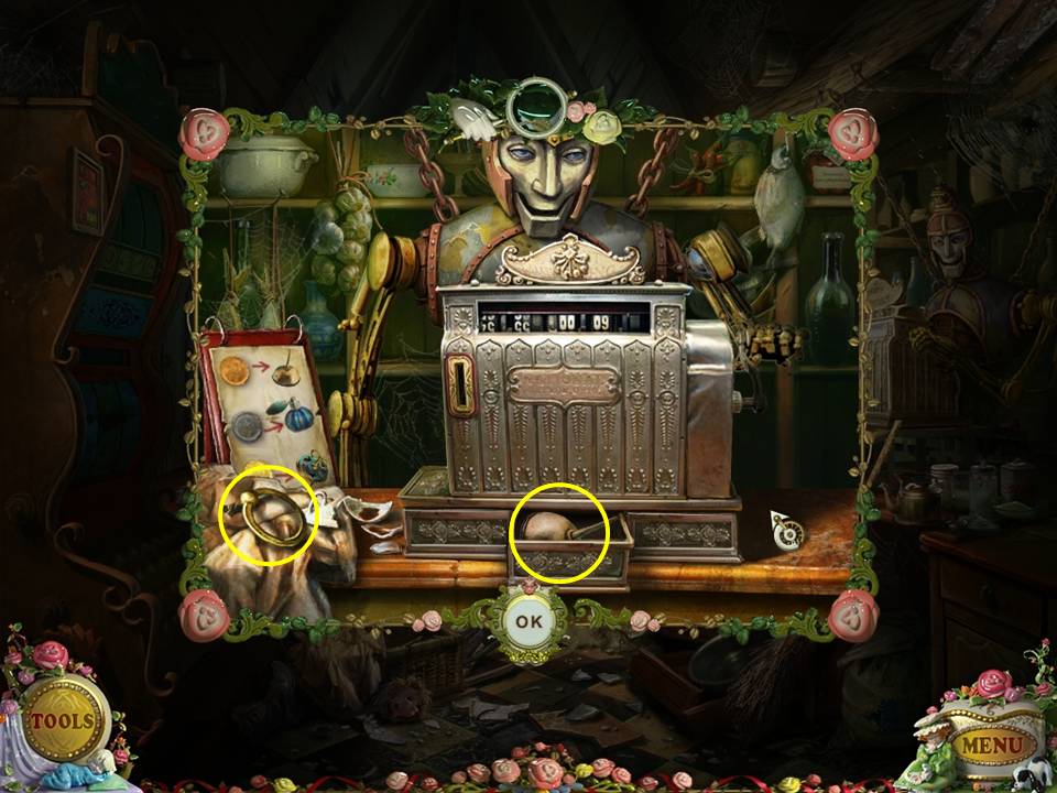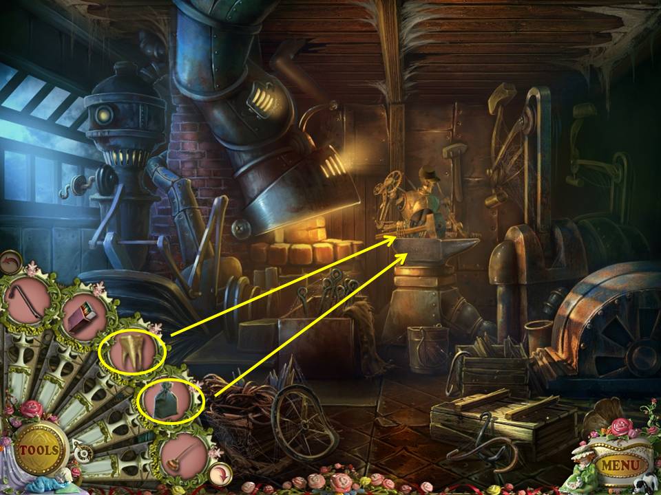 Zoom into the machine on the left. Hang the BAG WITH SAND on the hook to activate the machine. Zoom into the anvil. Place the BROKEN WHEEL on the anvil. The puppet begins repairing the wheel. When the puppet stops, zoom into the anvil and take the TRAIN WHEEL. Place the GOLDEN TOOTH on the anvil. When the puppet stops, zoom into the anvil and take the GOLDEN COIN. Return to the General Store. Play the Hidden Object Area in the back.