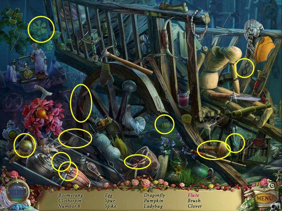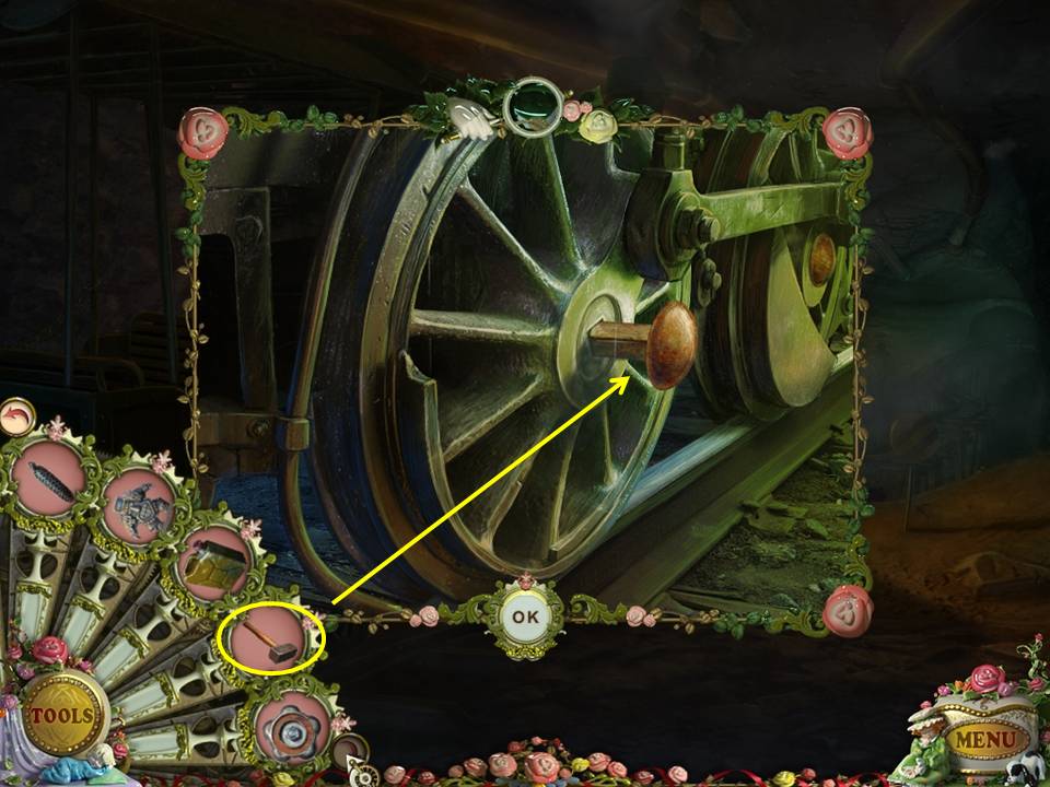 Pick up the BROKEN WHEEL from the ground. Play the Hidden Object Area to the left of where you picked up the BROKEN WHEEL.