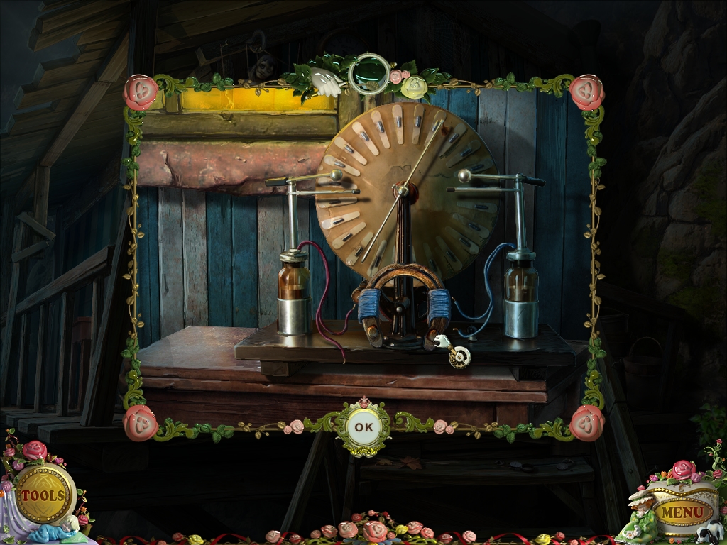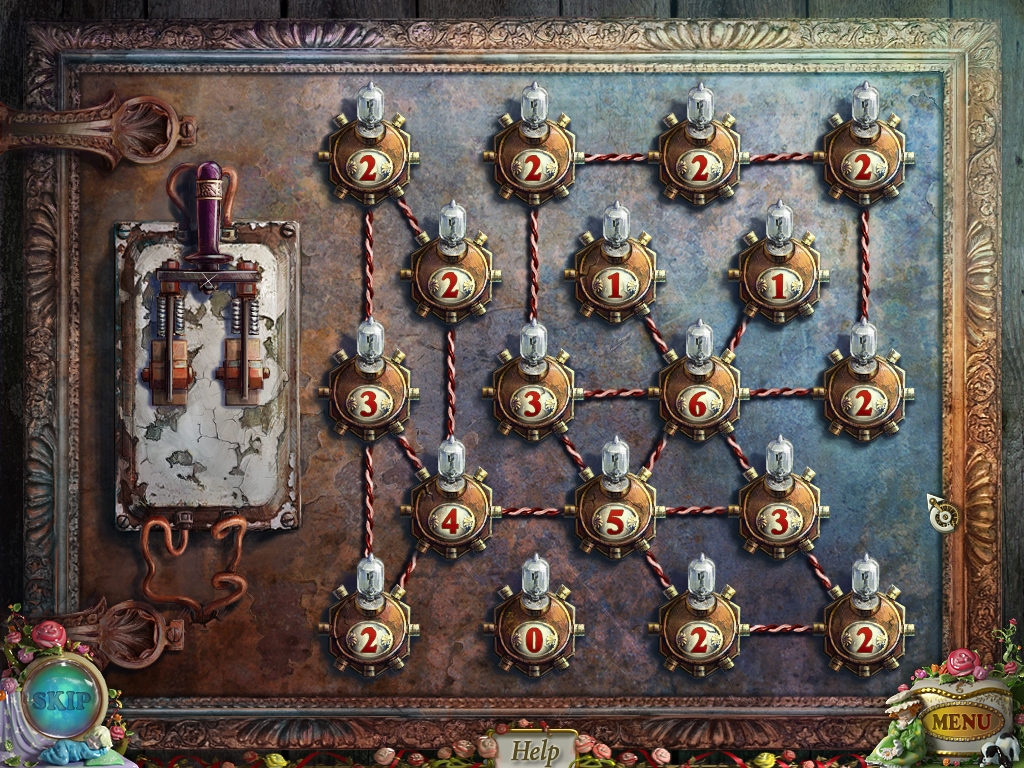 Remove the burnt bulb. Replace it with the BULB in your inventory. This will activate a puzzle. The object of the puzzle is to connect the bulb so that the number displayed in the center is equivalent to the number of wires attached to it. Place your cursor between the two bulbs you want to connect. A faint line will appear. Click on it to confirm the connection. If you make a connection in error, click on the wire to remove it. Connect wires until you have everything in place. When completed, flip the lever on the left to initiate power. Bulbs that have been connected correctly will light up. After you successfully complete this challenge, enter the Puppetmakerâs Shop and play the Hidden Object Area.