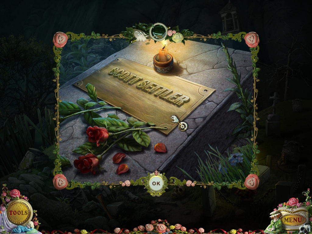 Zoom into the coffin on the lower right. Place the LETTERS on top of the coffin. The deceasedâs name, Scott Settler, appears. Open the coffin cover and pick up the BUTTERFLY RING. Play the Hidden Object Area again.
