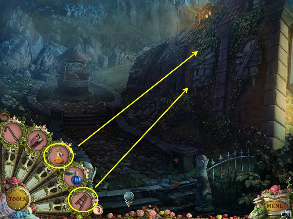 Place the LADDER on the side of the building. Zoom into the window. Use the WEED KILLER to kill the poison ivy. Open the window. Enter the building.