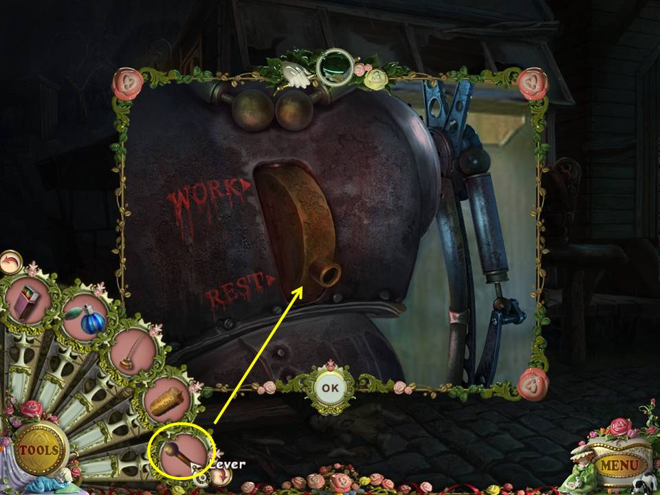 Find the items listed. Click on the blue ribbon in the lower left to tie the bow. Receive the LEVER. Return to the Saloon.