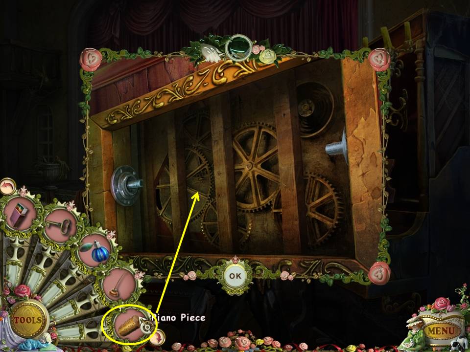 Zoom into the puppet playing the piano at far right. Zoom into the top part of the piano. Place the PIANO PIECE in the space.