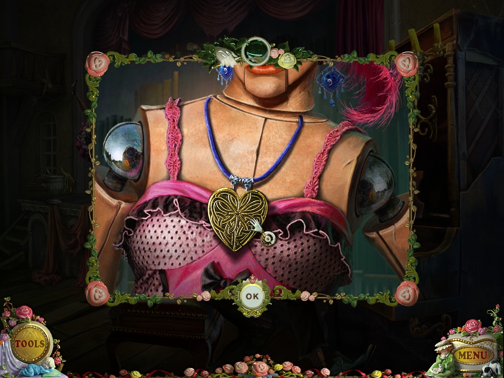Scale the ladder on the side of the building. Zoom into the headless doll on the chair. Place the PUPPET HEAD on the doll body. Open the latch and pick up the PENDANT. Return to the Saloon and go into the door on the upper left leading to the Bedroom. Play the Hidden Object Area again.