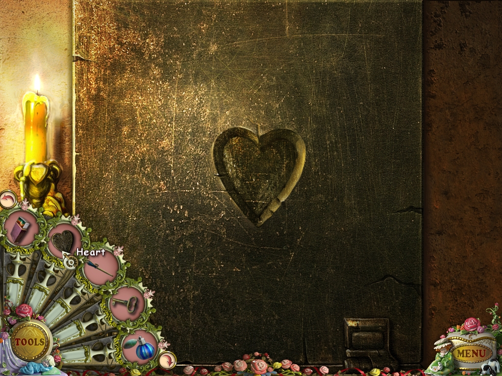 Click on the curtain in the upper left hand corner. Zoom into the door located there. Insert the HEART into the slot to initiate a puzzle.