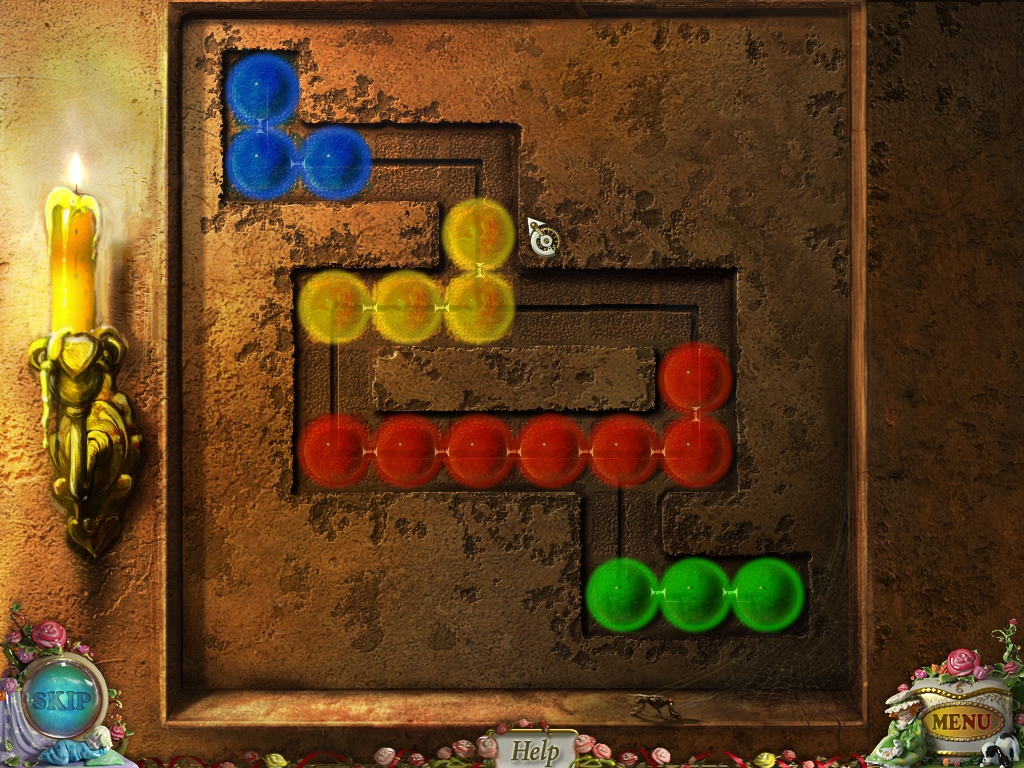 The object of this puzzle is to drag the balls in a string to pull it along the track through the channel that has its matching color. You can only drag a ball from either end of the string, not the middle. When correctly placed, the balls will light up. All balls must be lit to solve the puzzle and move forward. Proceed through the door into the Bedroom after solving the puzzle. Play the Hidden Object Area in the Bedroom.