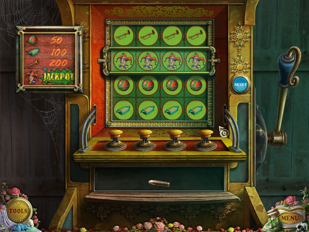 Zoom into the slot machine on the left. Place the LEVER on the right side of the machine. Buttons will be revealed. The object of the game is to press the buttons in the correct order to obtain 4 jokers across the middle line. Moving from left to right, count the buttons as 1, 2, 3, and 4. You can try this on your own and hit reset to begin again. To solve the puzzle, press the buttons in this order 1, 4, 3, 3, 1, 1. Pick up the BULLET from the coin tray. Return to the Guardhouse (click down four times from the store and enter on the left) and play the Hidden Object Area.