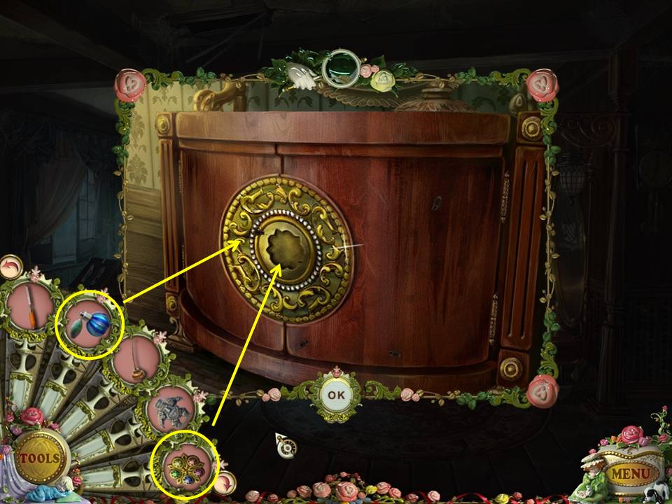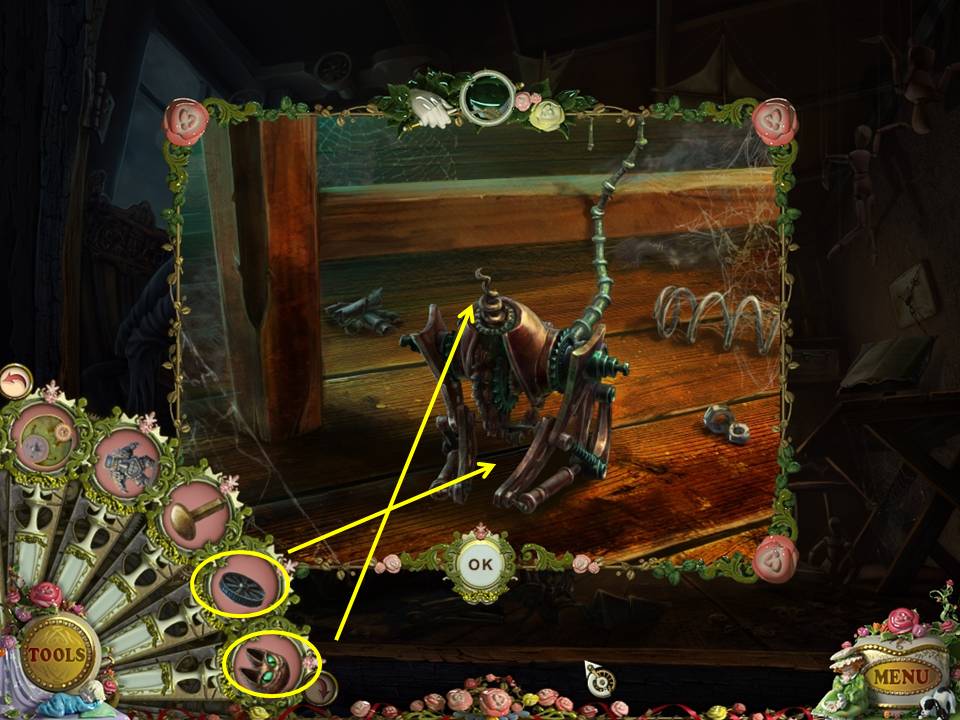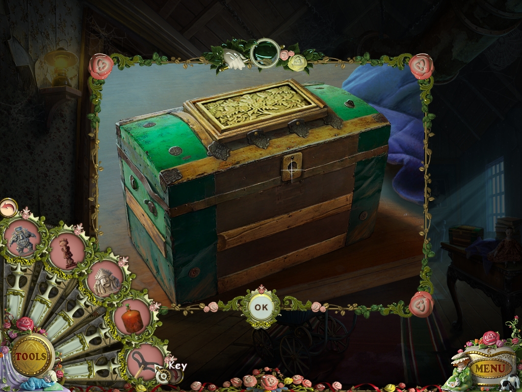 Open the chest to find the ball of yarn. Move the teddy bearâs arm to find the key. Receive the LADDER.