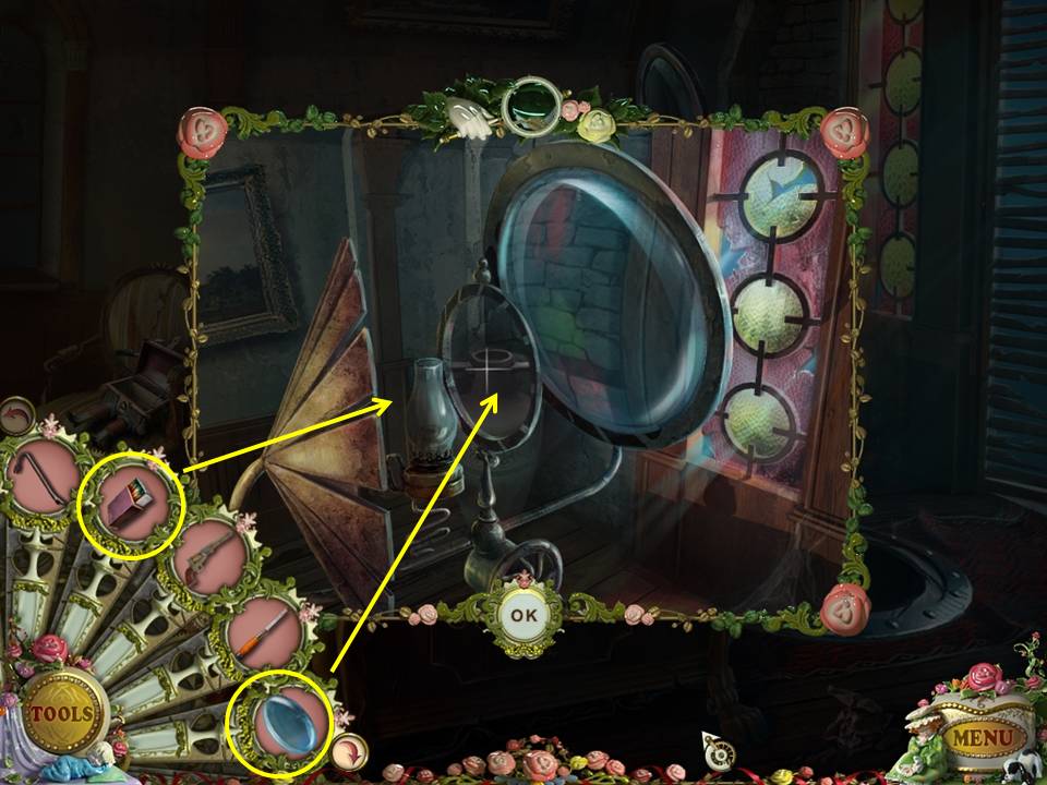 Scale the ladder on the side of the building. Zoom into the light magnifier. Place the LENS in the small frame. Put the MATCHES in the LANTERN next to the lens. A light will shine through the lens. Click down two times.