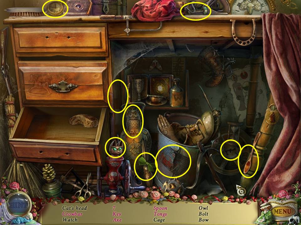 Find the items listed. Draw back the cloth on the right further to find the crowbar and the key. Open the top left drawer to find the tongs. Receive the CATâS HEAD.