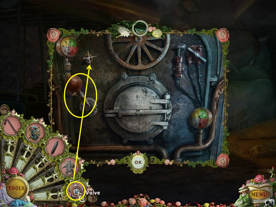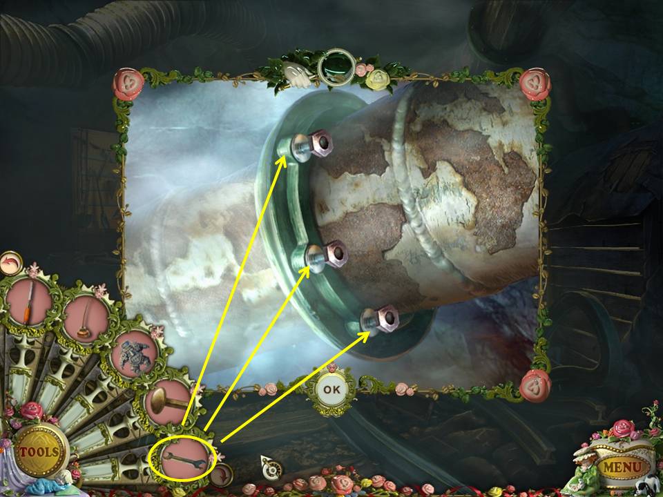 Zoom into the steaming pipe at the top right. Use the WRENCH on the 3 bolts to shut off the steam. Play the Hidden Object Area on the left.