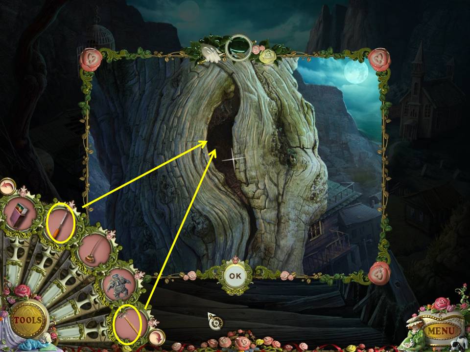 Zoom into the knothole in the tree on the top left corner of the screen. Insert the CHISEL into the hole. HAMMER on the CHISEL two times. Pick up the GOLDEN TOOTH. Move right toward the Cemetery.