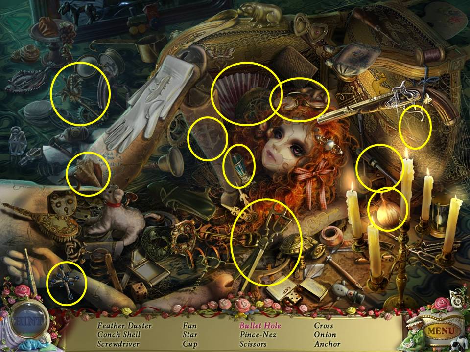 Find the objects listed. Shoot the revolver to obtain the bullet hole. Receive the SCREWDRIVER. Play this Hidden Object Area a second time.