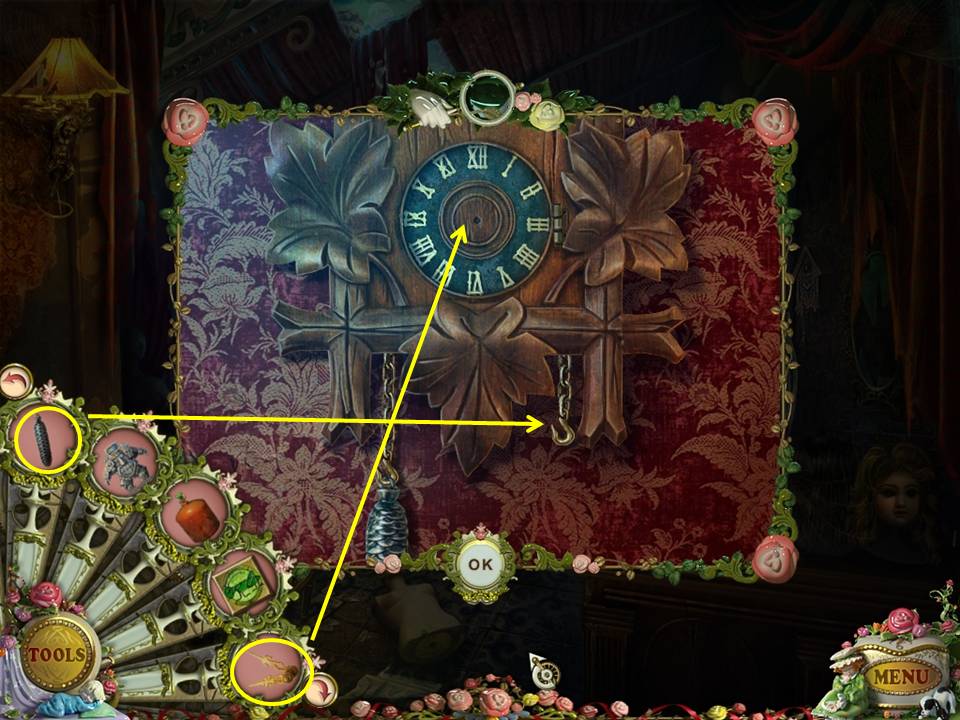 Zoom into the cuckoo clock. Place the CLOCK HANDS and CLOCK WEIGHT on the clock. Clock will open. Pick up the IVORY STATUE inside the clock. Return to the Estate and play the Hidden Object Area there.